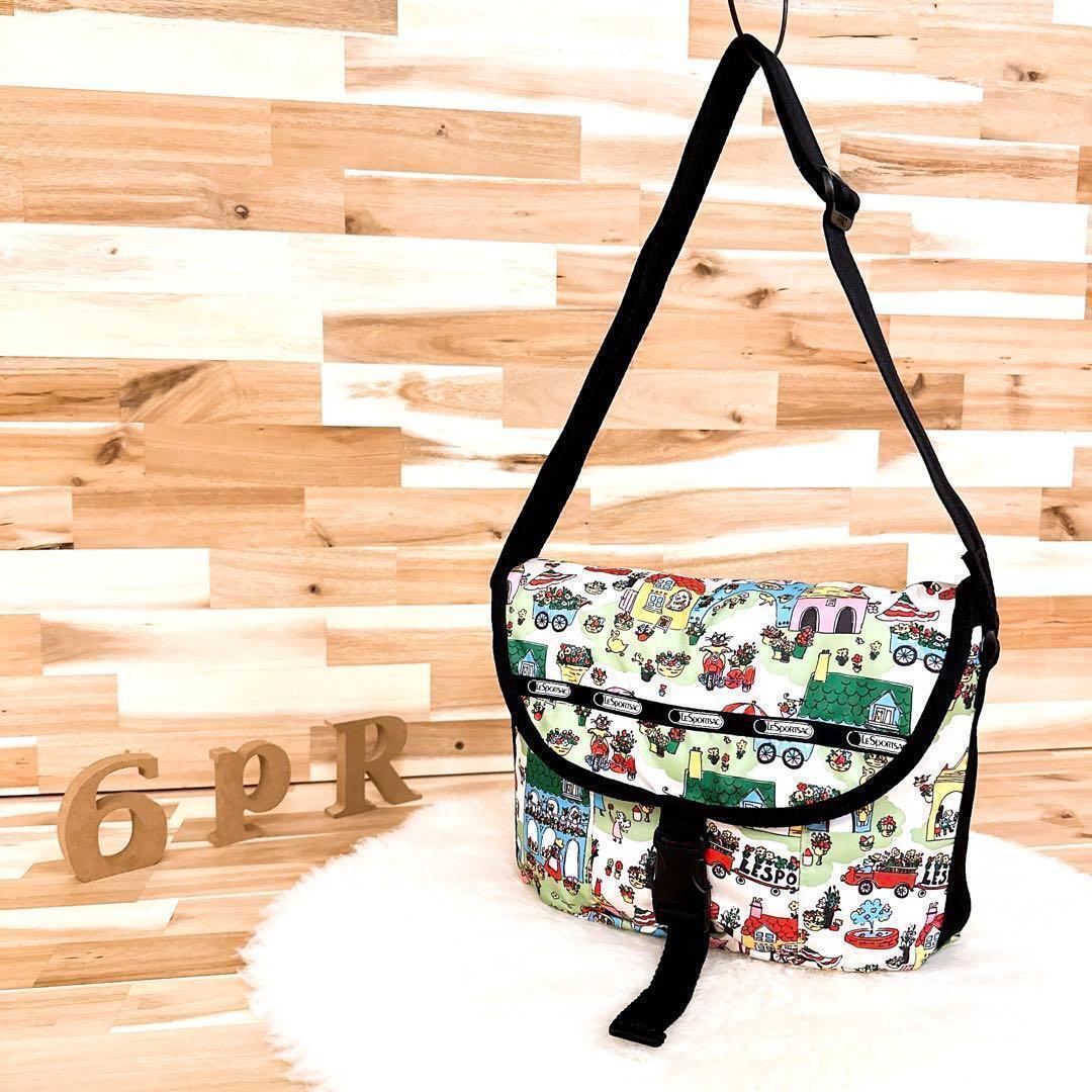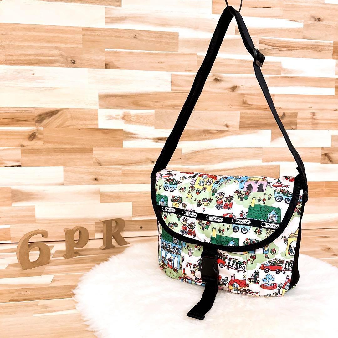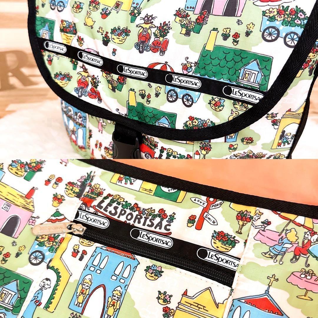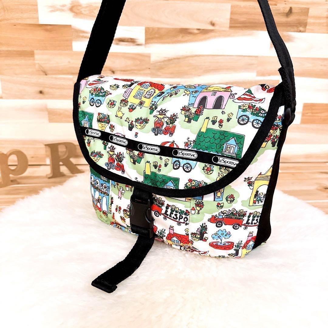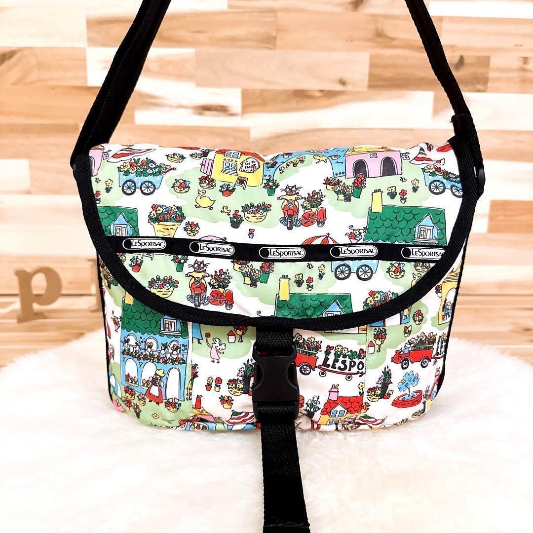 * 花柄 / フラワー / 街 *鮮やかなプリントがひときわ目を引き、花々に囲まれた街並みや動物モチーフがポップに描かれているのが魅力的。軽やかなナイロン素材とフラップデザインが合わさり、程よいサイズ感で日常に取り入れやすい華やぎを添えてくれるLeSportsacのショルダーバッグです。