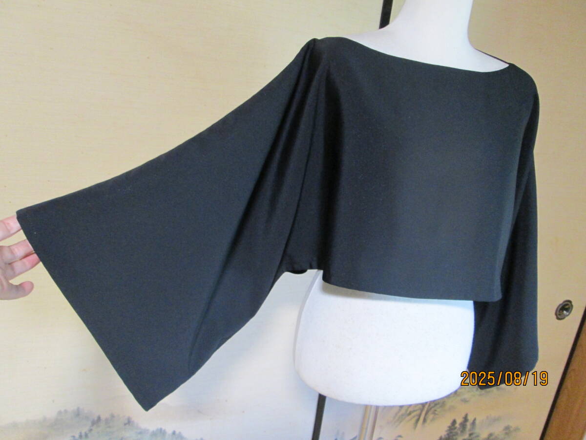 黒地でシンプルな被りボレロなのでお手持ちのお洋服にも合わせやすいかなと思います。