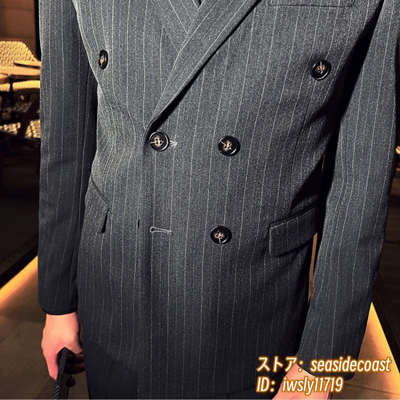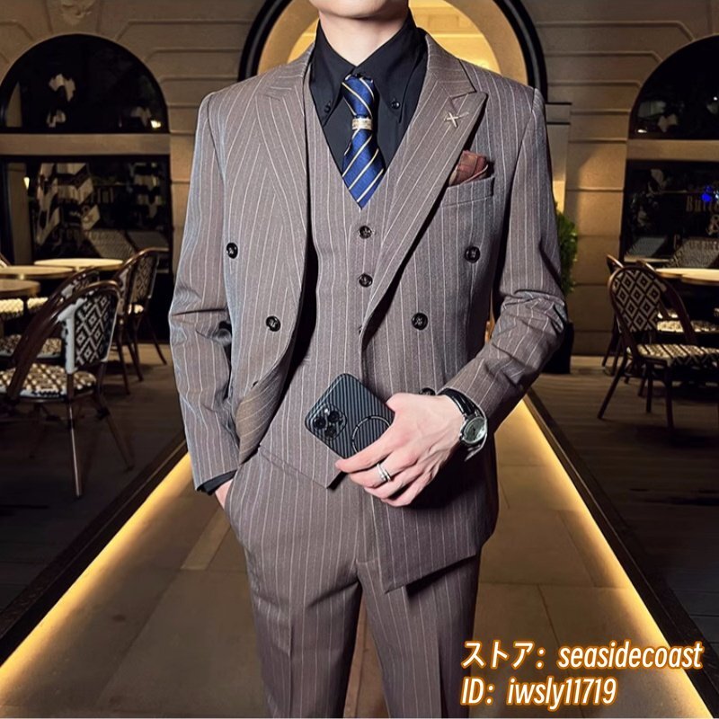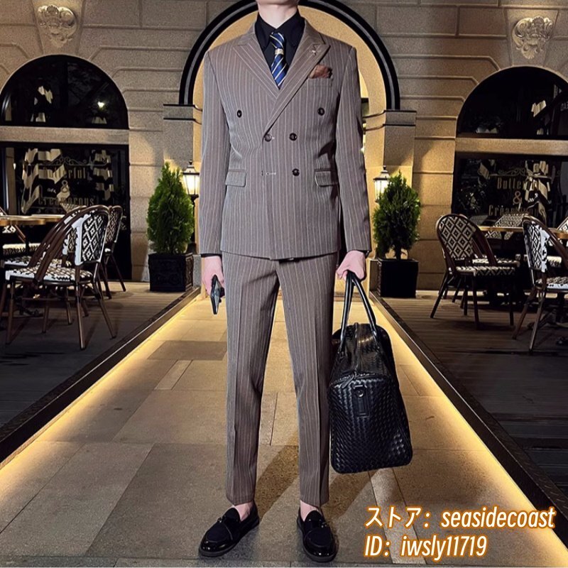 極上新品♪スリーピース メンズ ダブルスーツ スーツセット ストライプ柄 結婚式 スタイリッシュ 背広 二つボタン 紳士服 珈琲色 XL