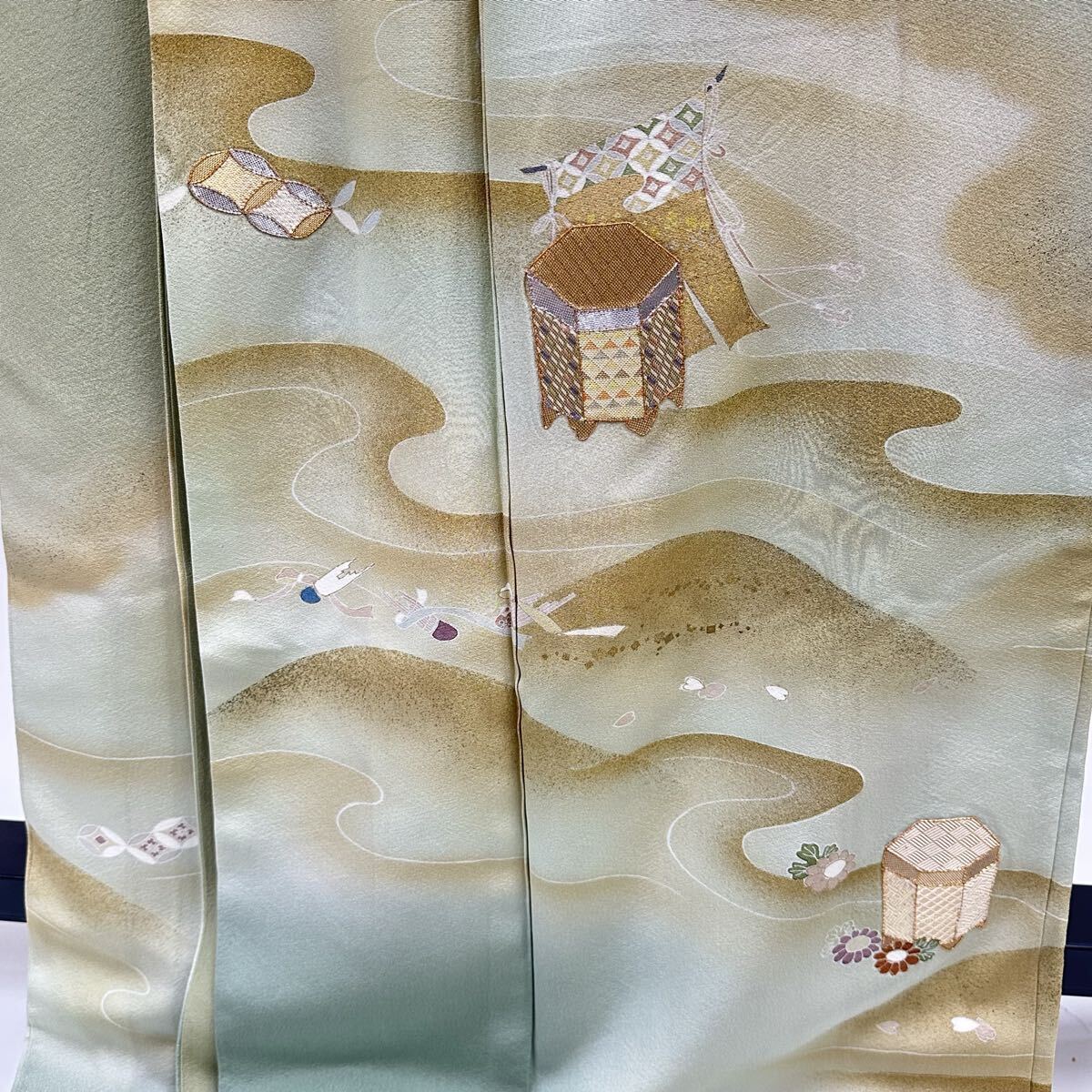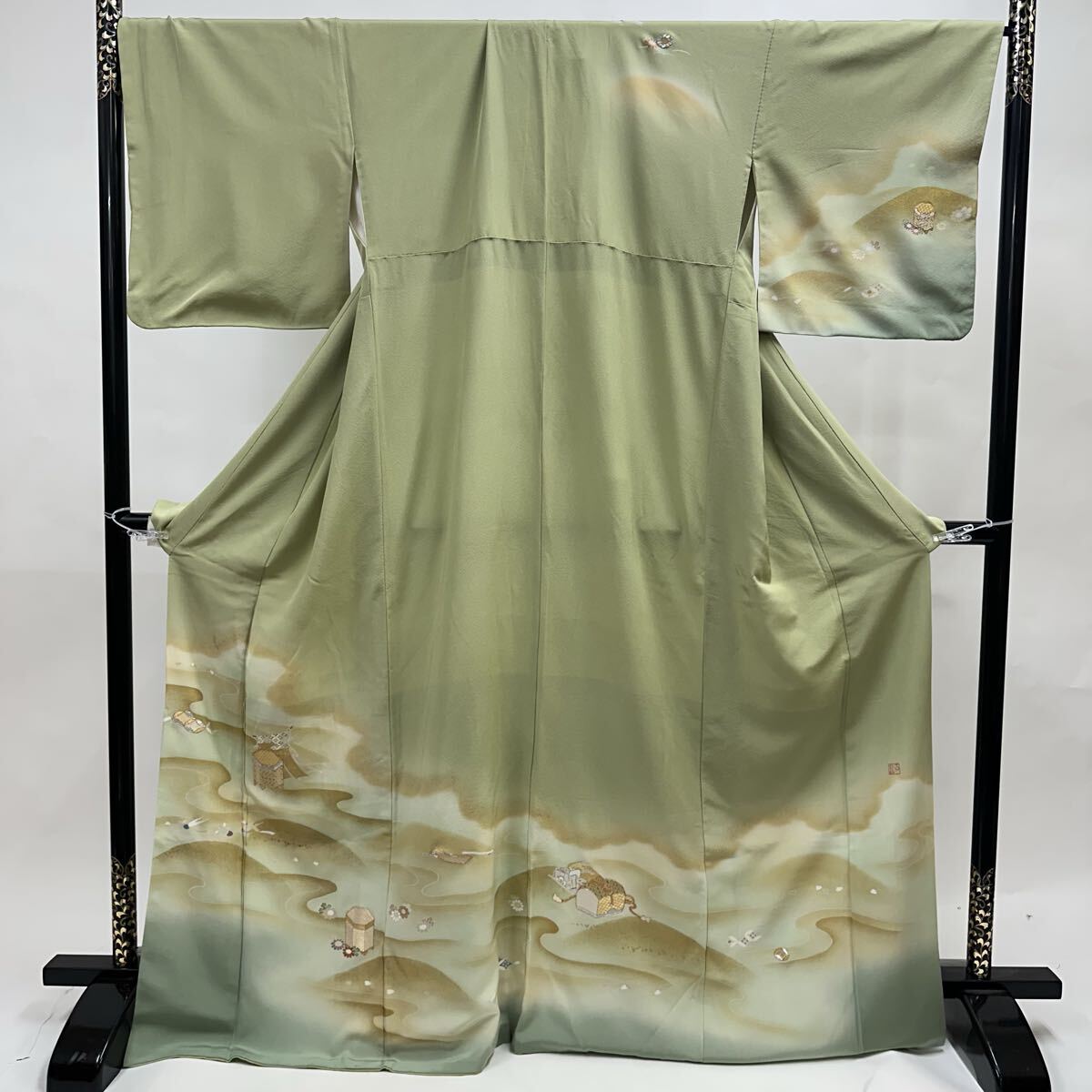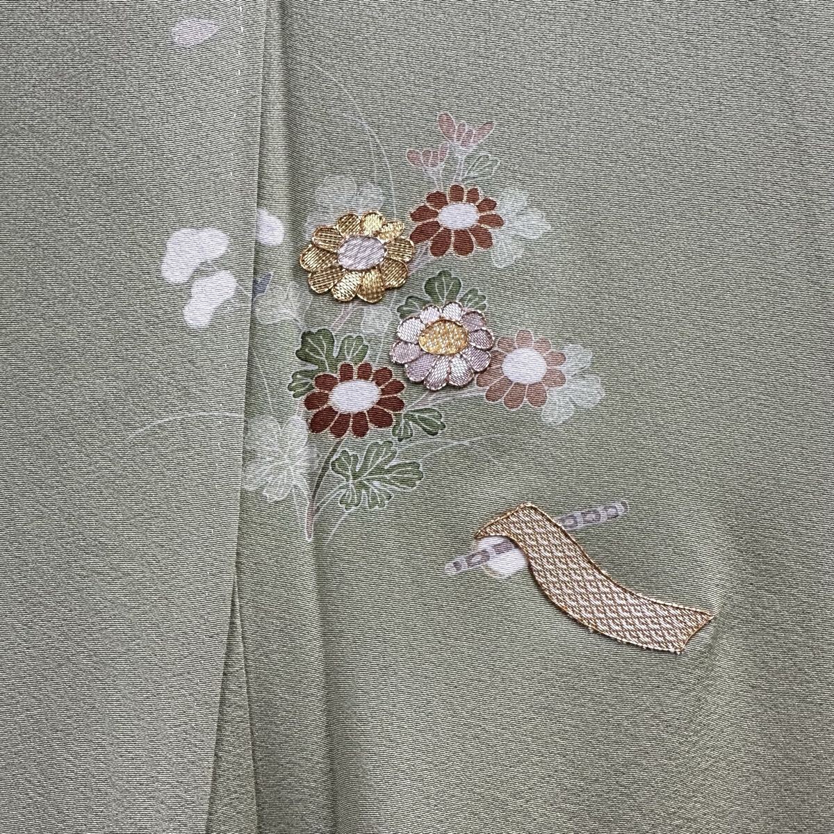 【七福】c777 訪問着 刺繍 正絹 袷仕立て 落款 金コマ刺繍 金彩 金糸 銀糸 着物 逸品 身丈 約166.5cm 裄 約66cm