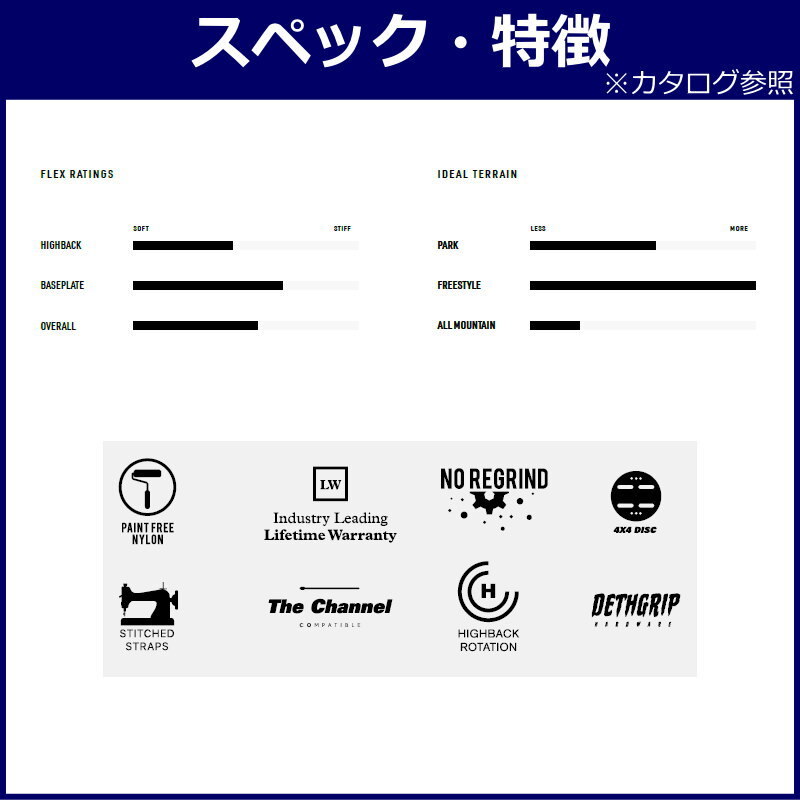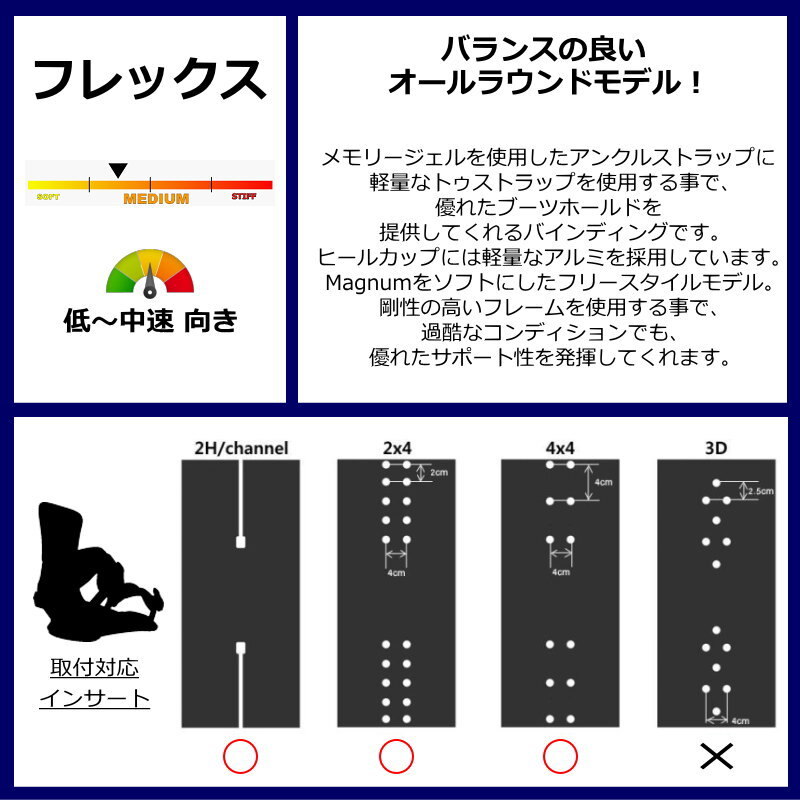 メモリージェルを使用したアンクルストラップに 軽量なトゥストラップを使用する事で、 優れたブーツホールドを 提供してくれるバインディングです。 ヒールカップには軽量なアルミを採用しています。 Magnumをソフトにしたフリースタイルモデル。 剛性の高いフレームを使用する事で、 過酷なコンディションでも、 優れたサポート性を発揮してくれます。