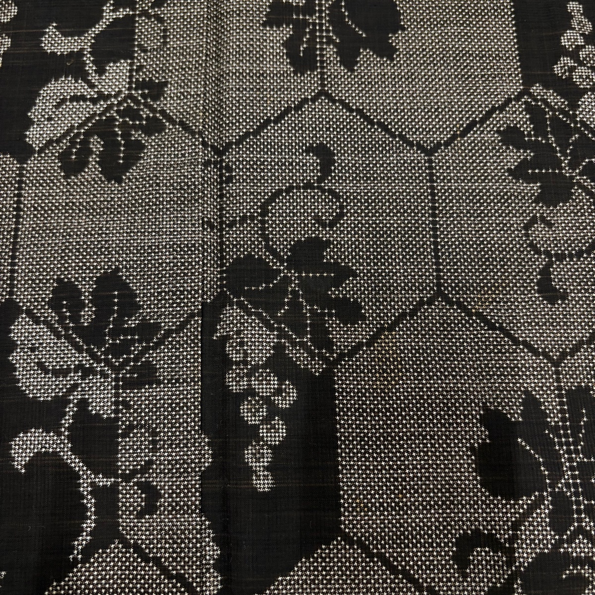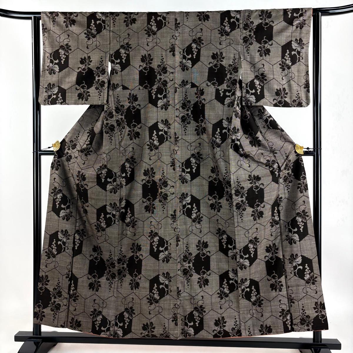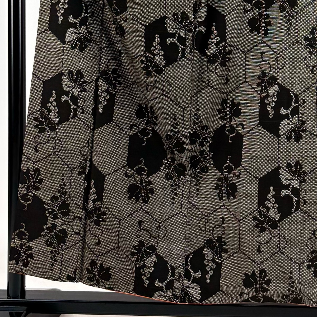 | 紬 秀品 葡萄唐草 亀甲 焦茶色 袷 身丈156 裄丈62.5 S 正絹 【中古】 |