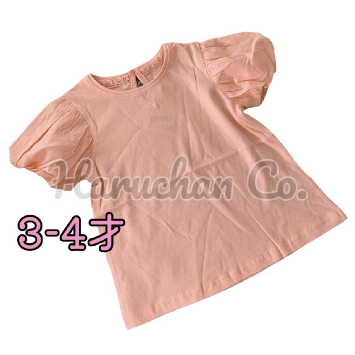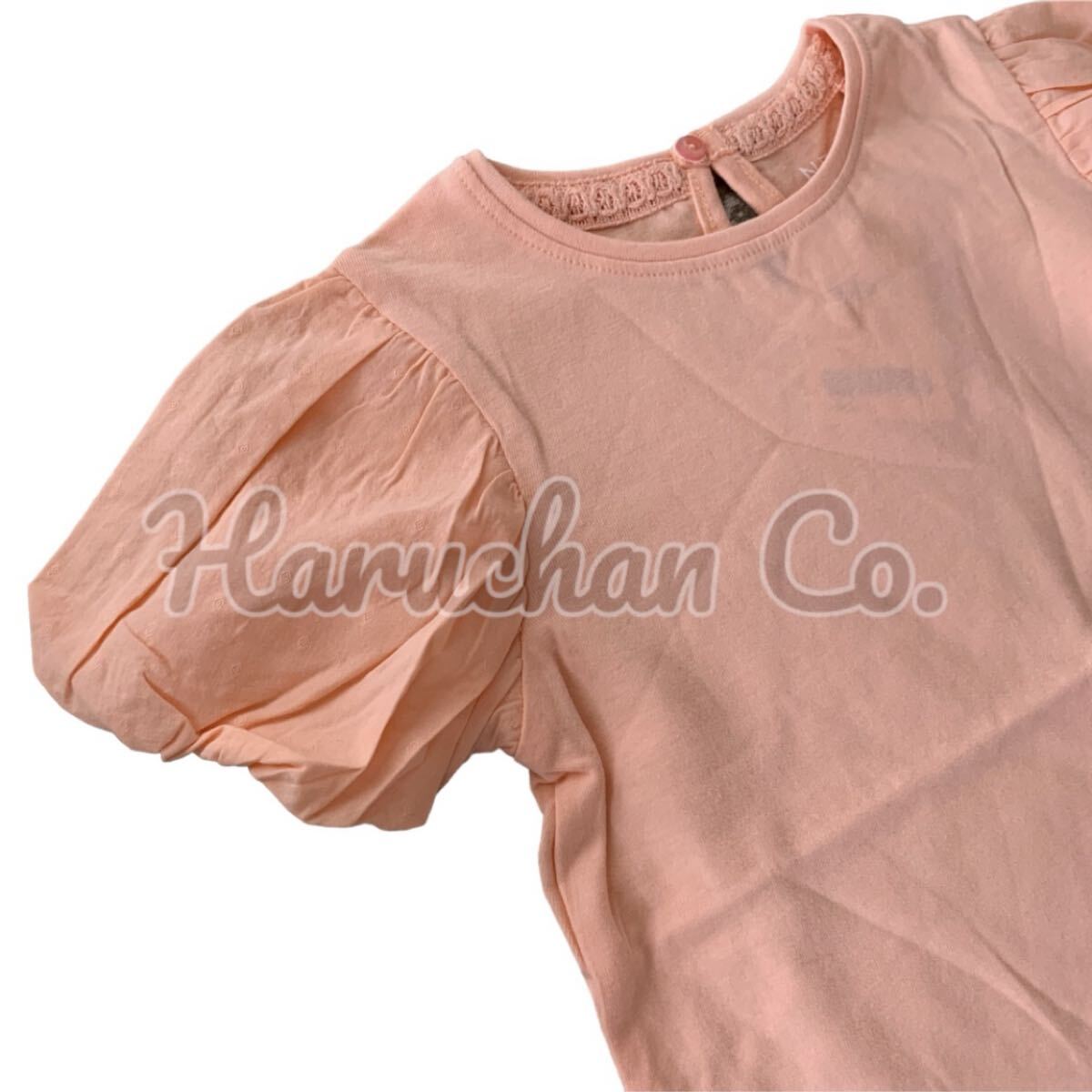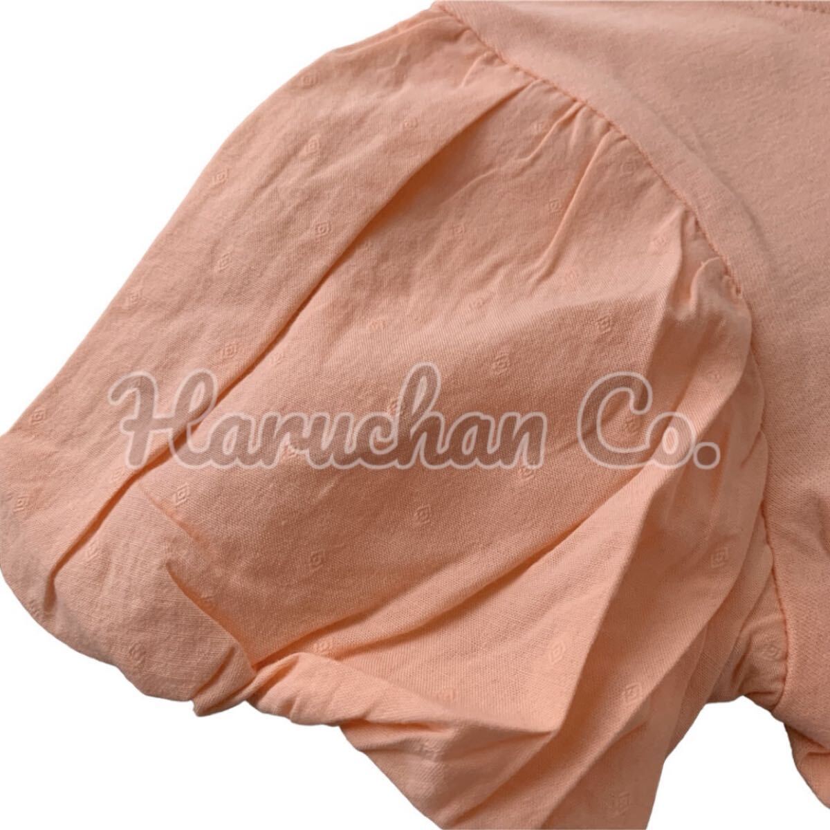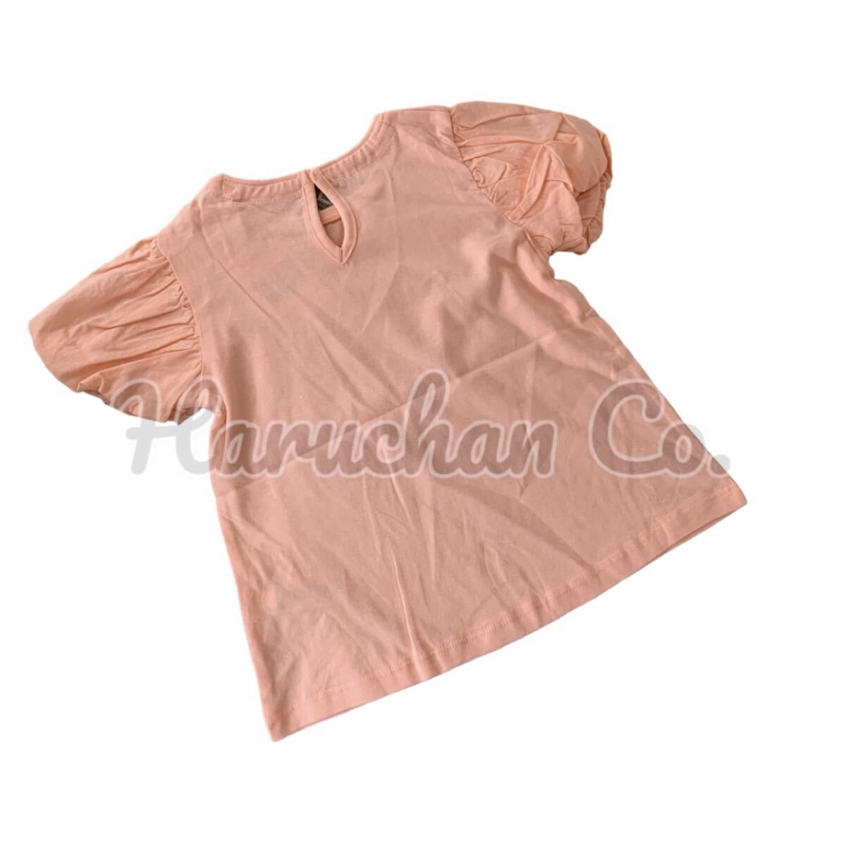 サーモンオレンジの、シャツ素材のパフスリーブがキュートなカットソー