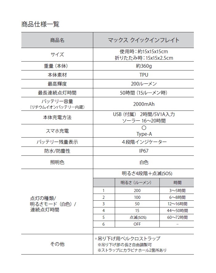 ソーラー&USBの2種類の本体充電方式をもつインフレータブルLEDランタン。