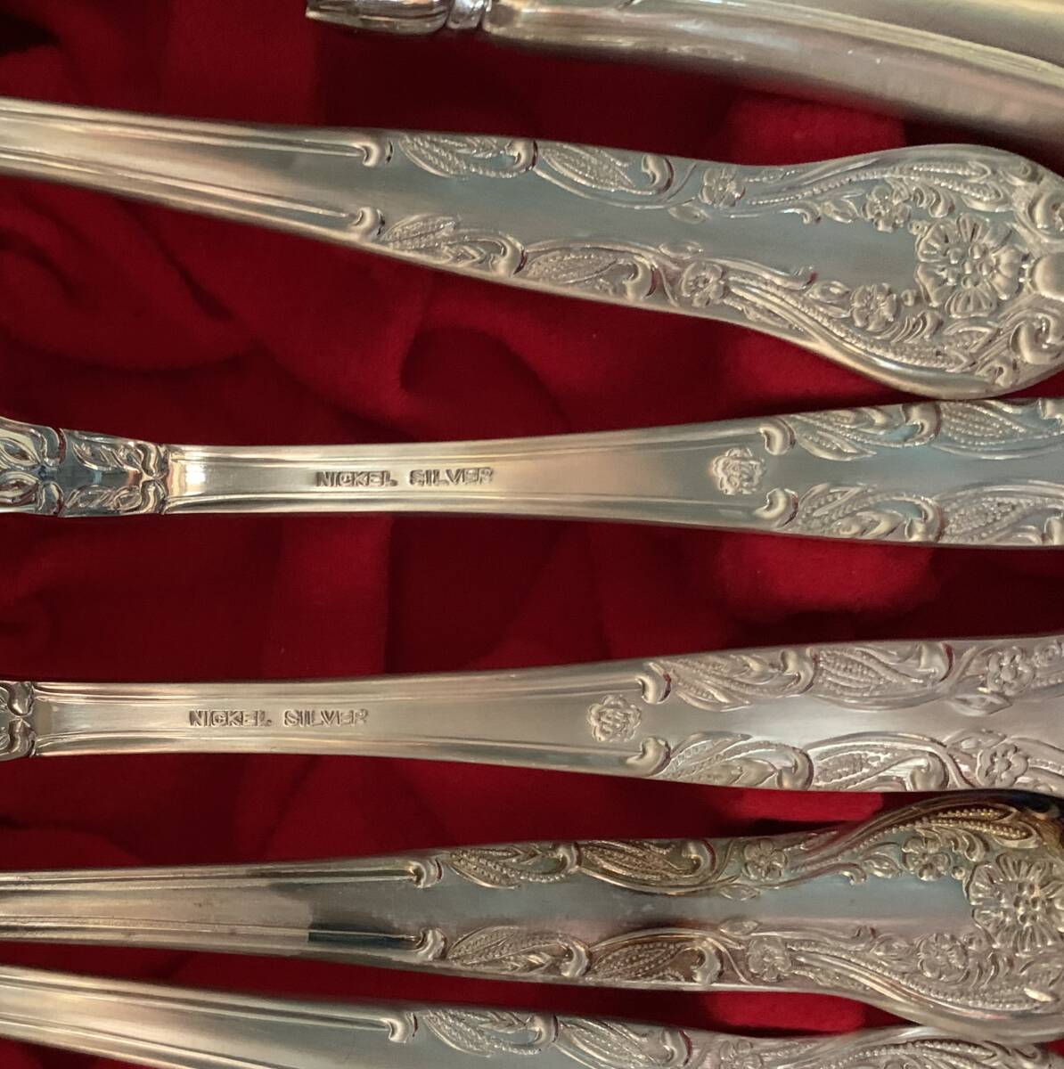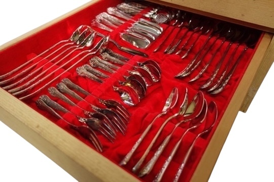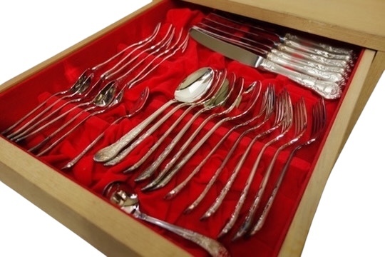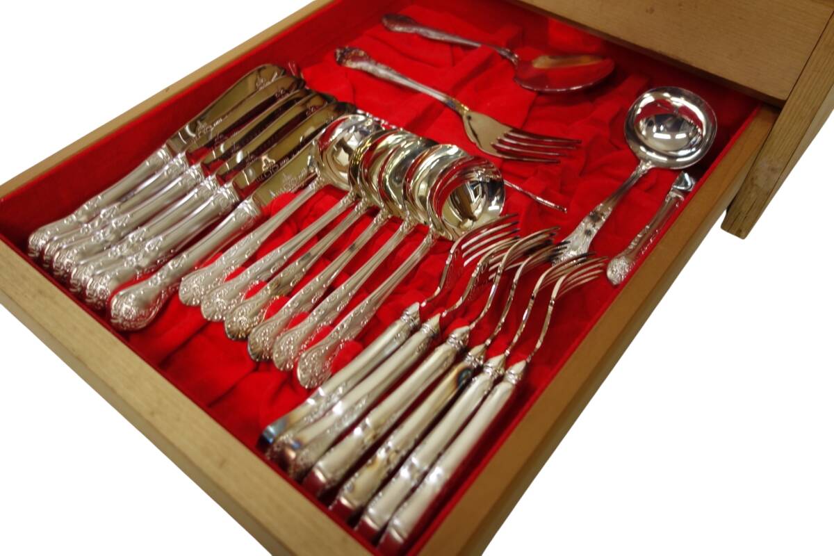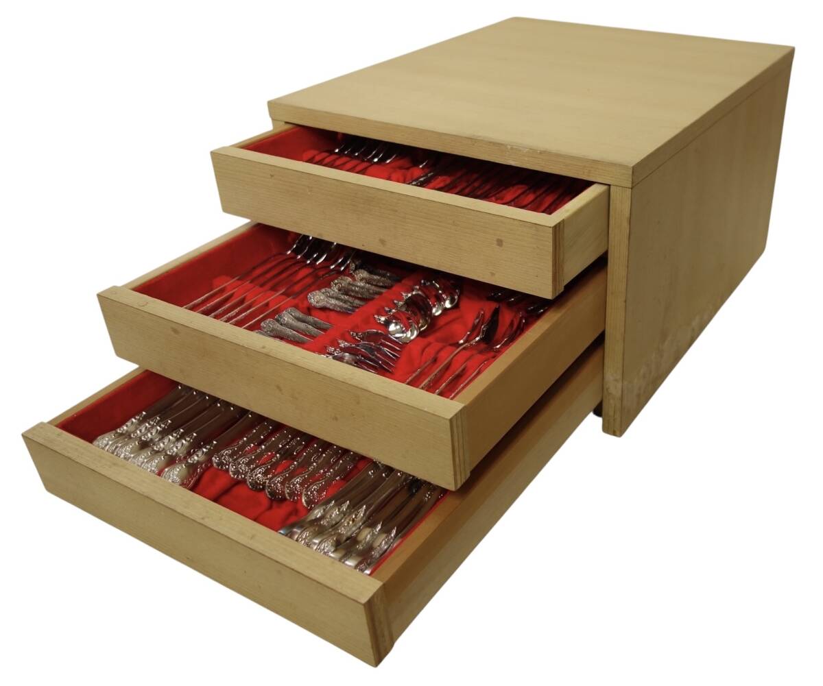 赤いベルベット調の内張りが施された、木製の3段引き出しにニッケルシルバーのカトラリーが104点入った豪華なフルセット仕様のカトラリーボックスです。持ち手にクラシカルな草花模様のエンボス装飾が施され高級感溢れる素晴らしい逸品!