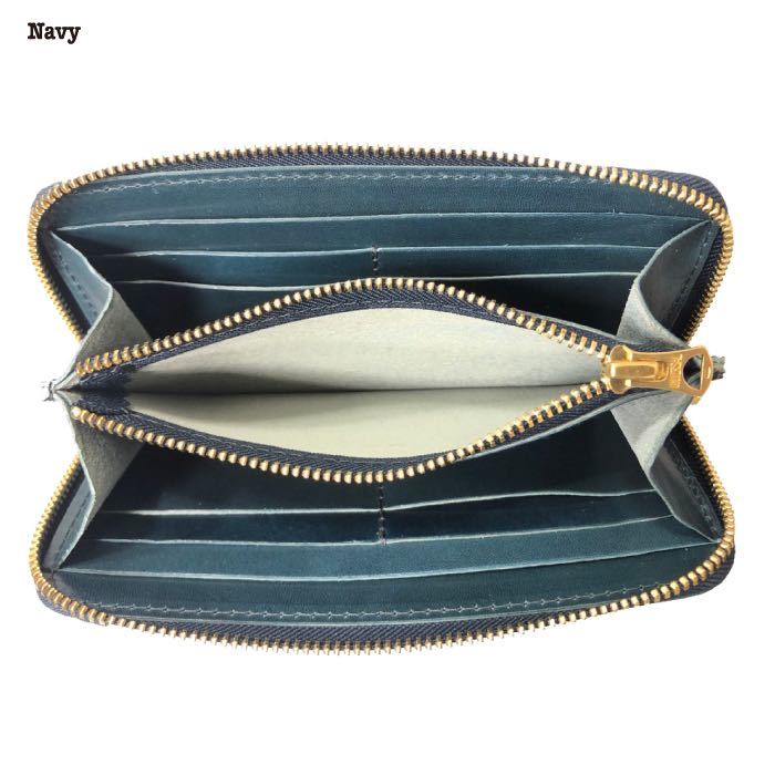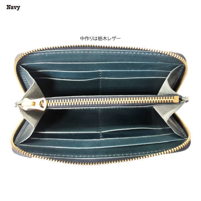 ■表面に新喜皮革社オイルコードバン(グレージング加工)、中作りを栃レザー社オイルレザーと贅沢な革の使用をしたラウンドファスナー長財布です。