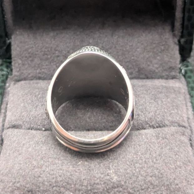 フェイス中央には鮮やかなブルーストーンがセッティングされ、サイドには立体的な人物像や象徴的なモチーフが緻密に彫刻されています。