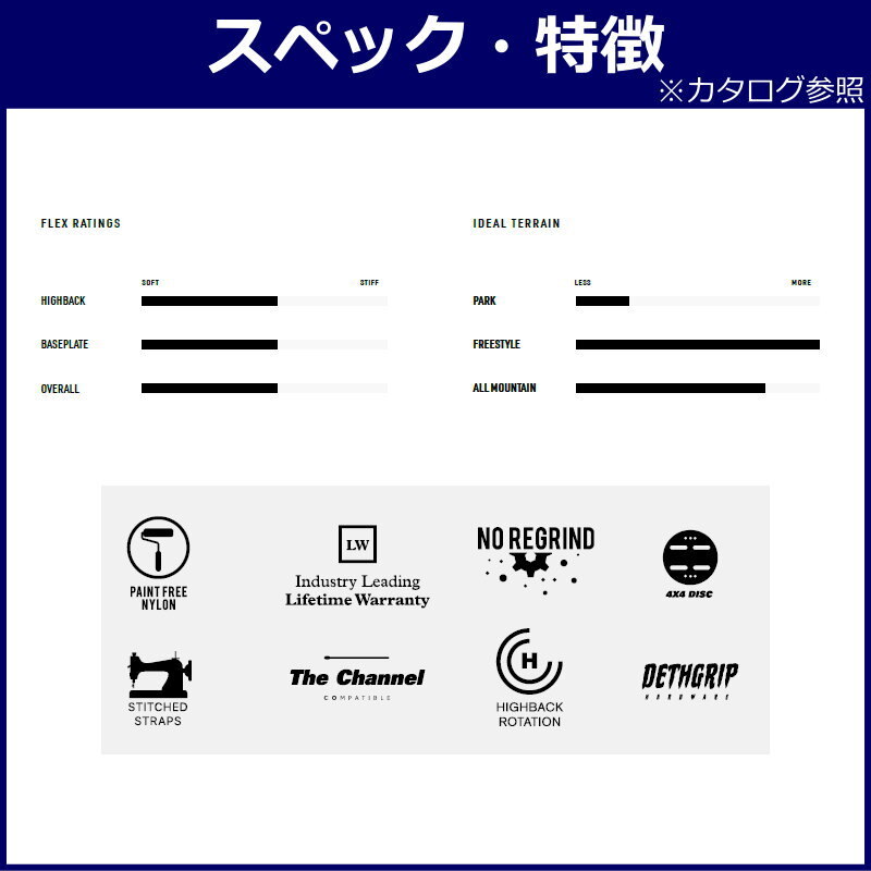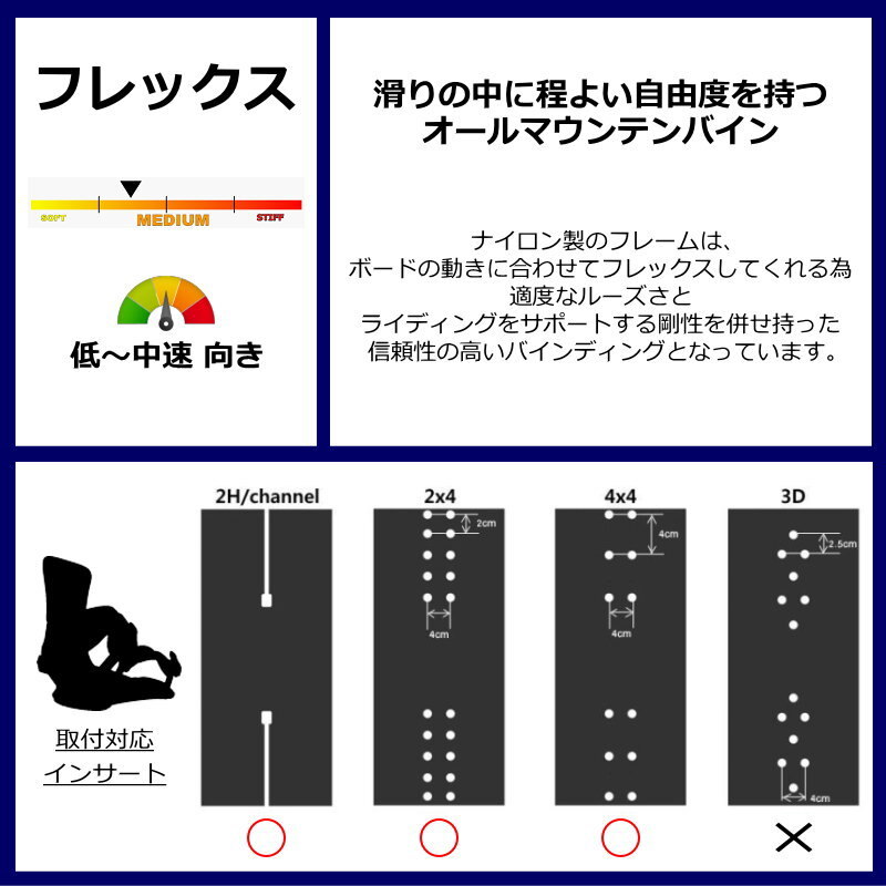 中級者から上級者向けの軽量オールマウンテンバインディング。上級者にも十分な硬さを持つミディアムフレックスバインディングでありながら、予算重視のスノーボーダーにもお求めやすい価格を実現しています。ナイロンフレームはボードの動きに合わせて柔軟に曲がり、扱いやすく楽しいだけでなく、しっかりとした信頼性の高いバインディングです。