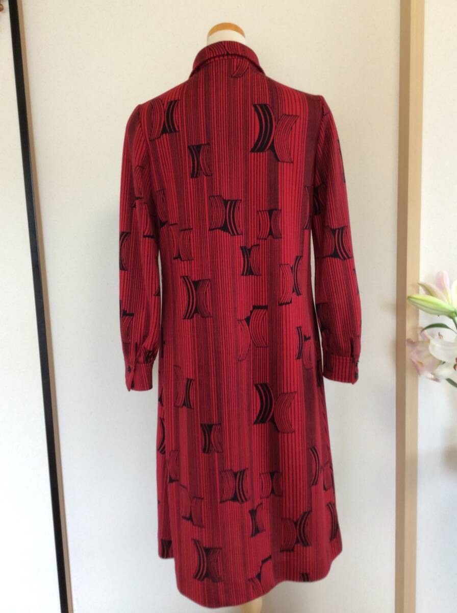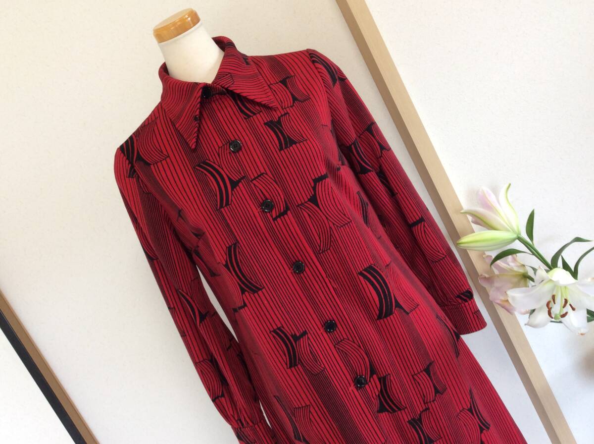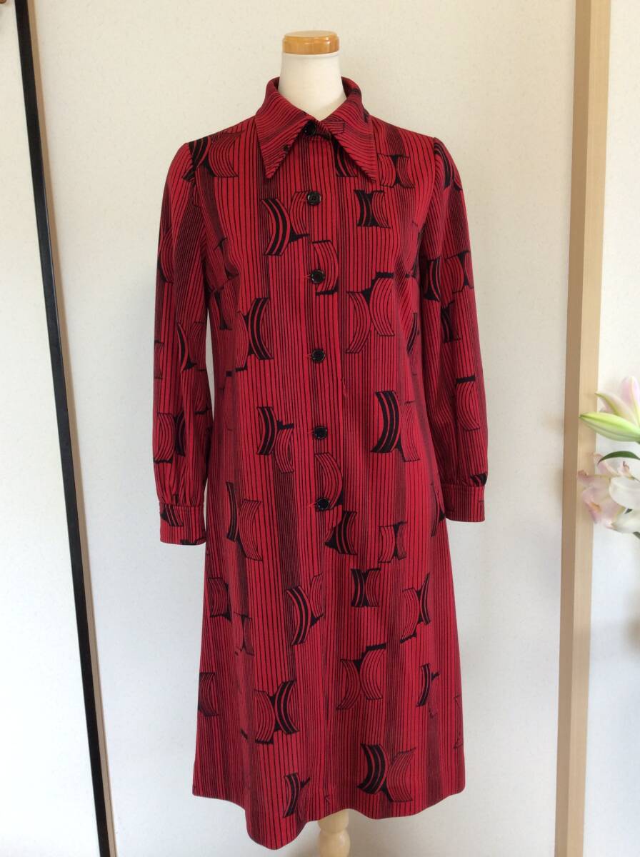 出品者よりひと言…古着屋が好きでよく行くのですが、そちらで見つけたレトロワンピースになります。大き目の襟、赤地に黒の幾何学模様、少しだけ裾に向かってフレアなデザインの素敵なワンピース♪ 生地は地厚めなのでこれから秋冬にもどんどんお使い頂けます。お造りもしっかりとしていて、着脱は前に付いているボタンの開閉で行います。よろしくお願いいたします。