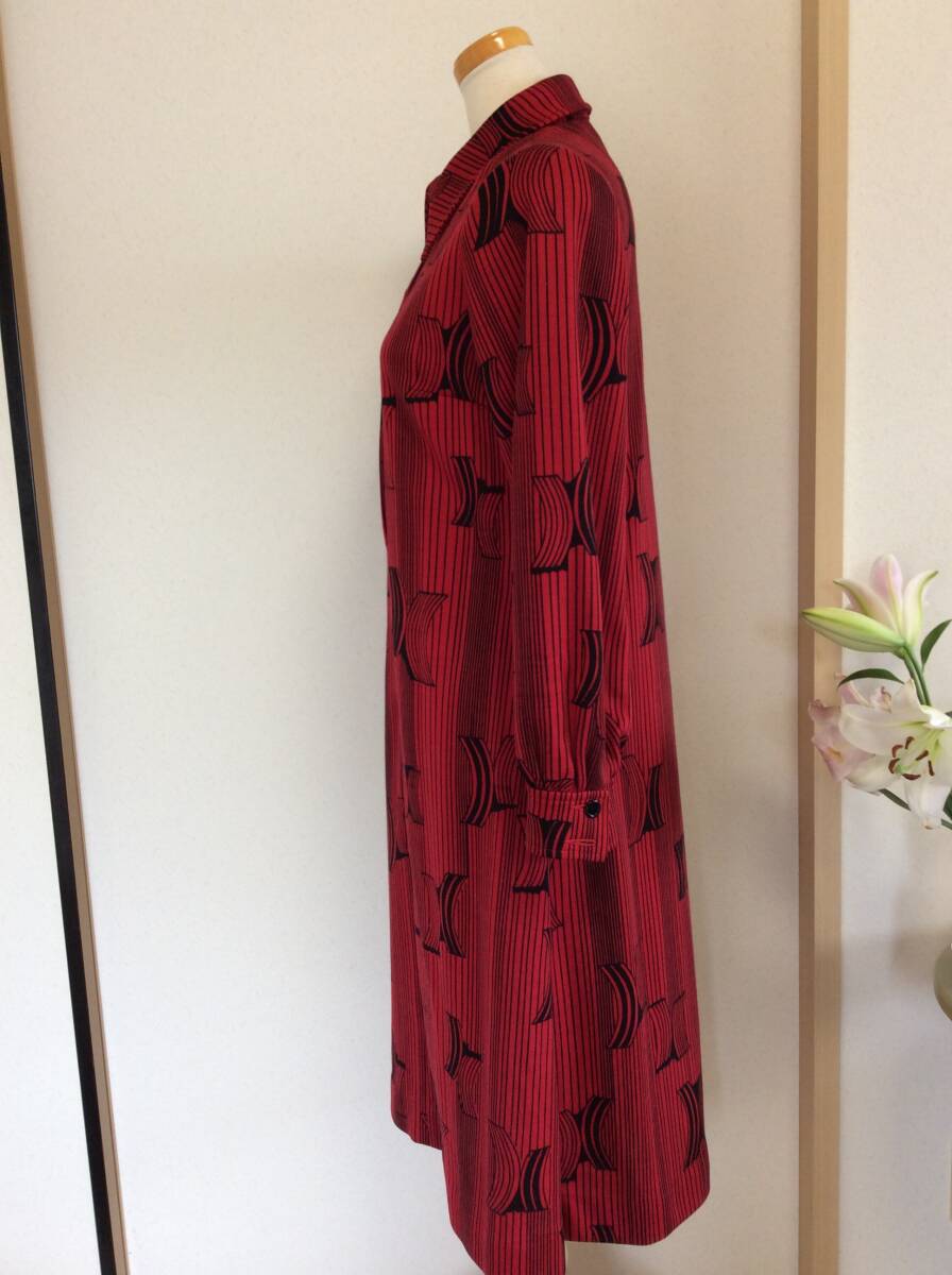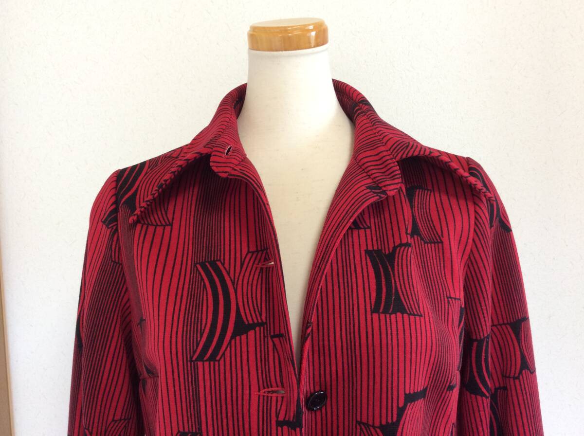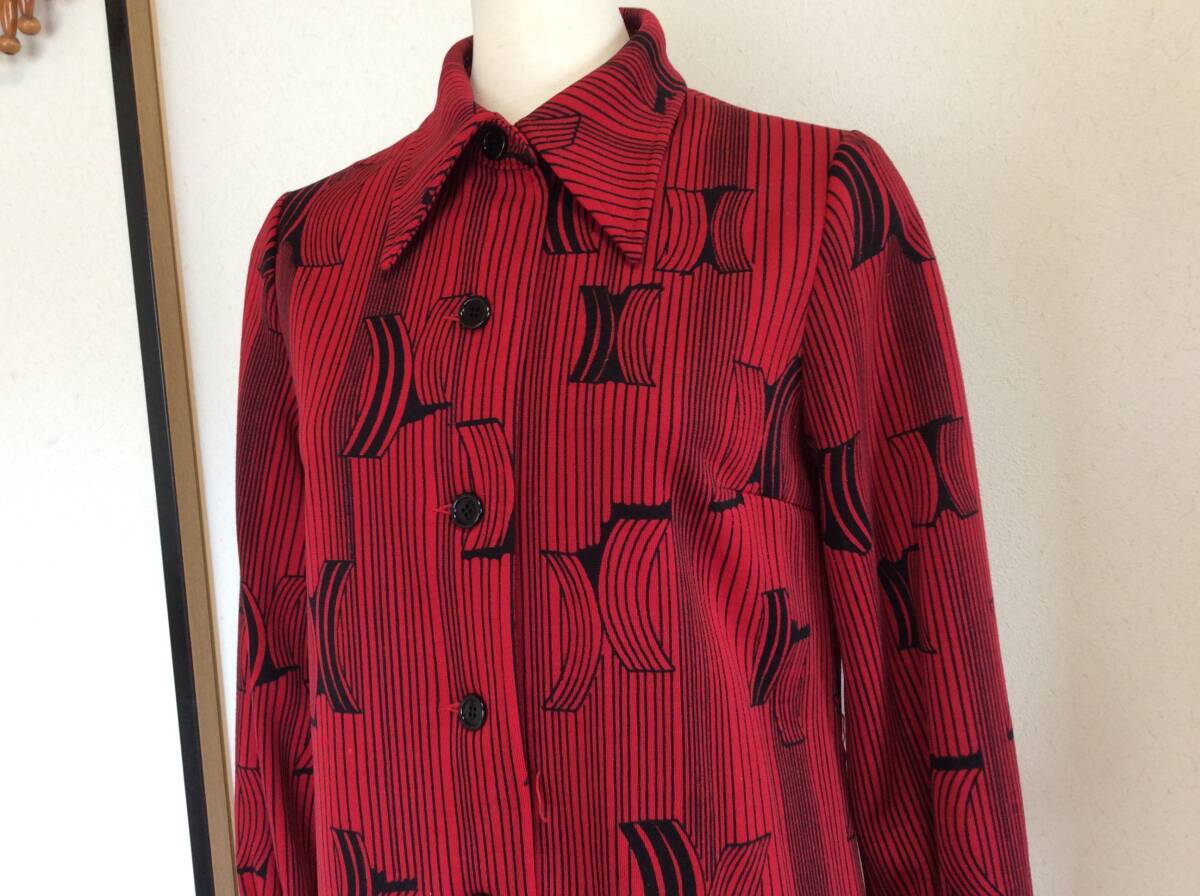 出品者よりひと言…古着屋が好きでよく行くのですが、そちらで見つけたレトロワンピースになります。大き目の襟、赤地に黒の幾何学模様、少しだけ裾に向かってフレアなデザインの素敵なワンピース♪ 生地は地厚めなのでこれから秋冬にもどんどんお使い頂けます。お造りもしっかりとしていて、着脱は前に付いているボタンの開閉で行います。よろしくお願いいたします。