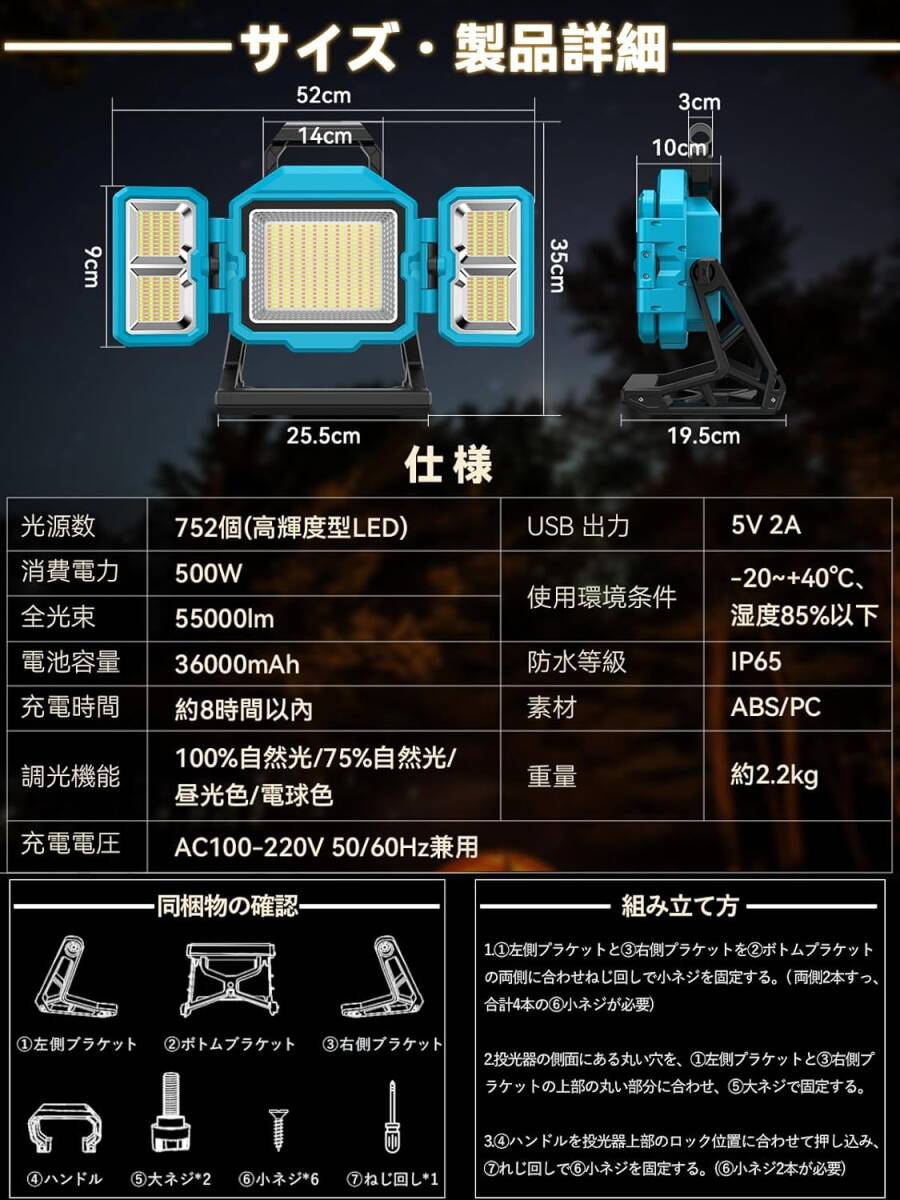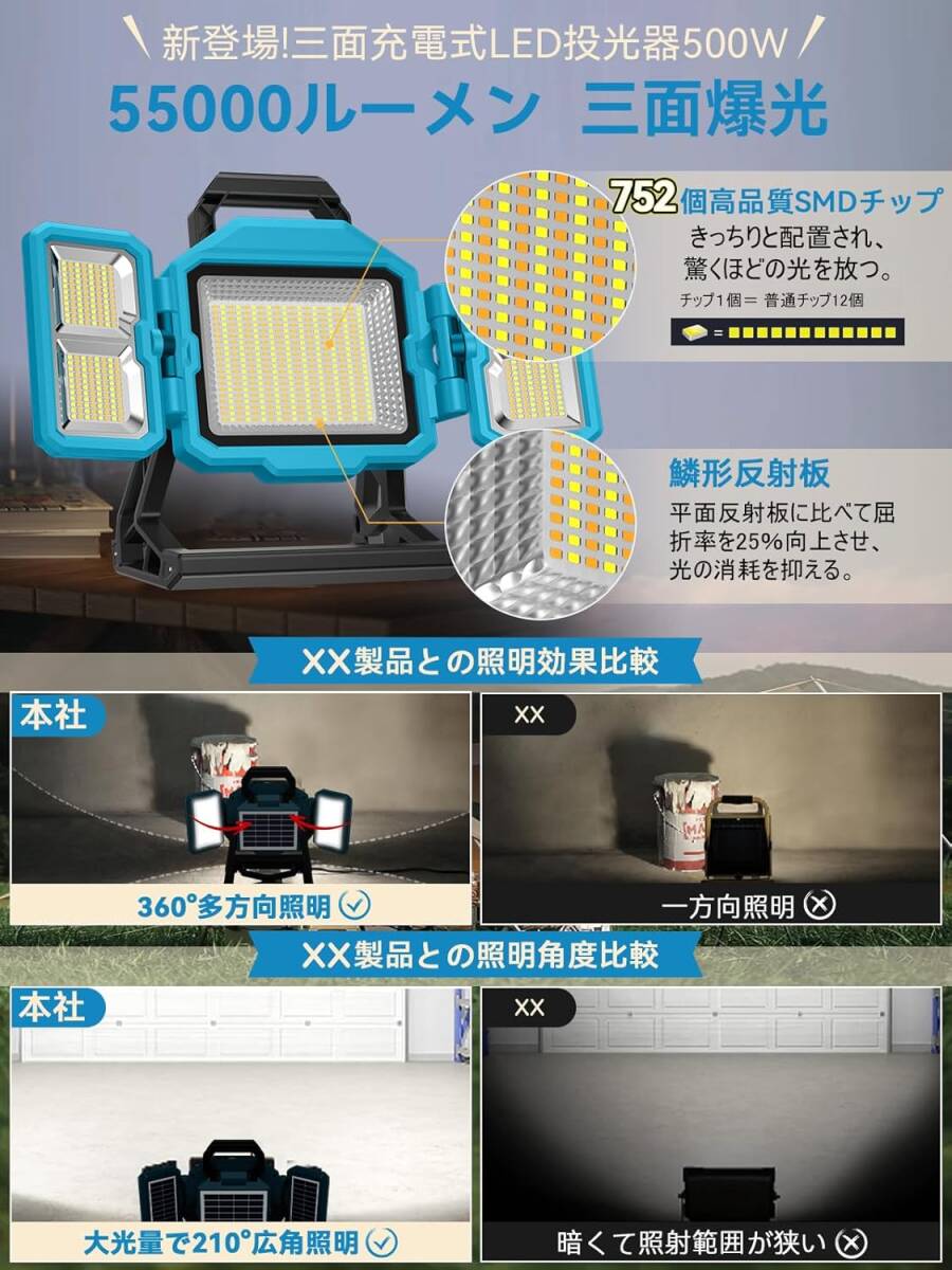 500W 55000LM 投光器 led 作業灯 屋外照明 超高輝ワークライト キャンプ アウトドア 常備灯/登山/夜釣り/防災/緊急/停電対策/屋外照明