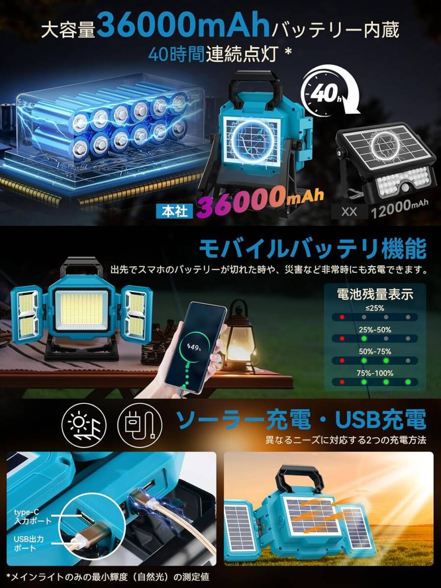 【USB急速充電・ソーラー充電・長寿命・省エネ・高効率】USB急速充電機能により、投光器はさまざまな状況ですぐに電力を補充できます。家庭用コンセントでもモバイル電源でも、素早く便利に充電でき、使いやすさが向上します。ソーラー充電により、投光器にグリーンエネルギーのオプションが追加されます。屋外や停電時でも、太陽光を利用して継続的に電力を供給できるため、従来の電力への依存を軽減できます。使用の持続性が向上します。この非常灯は、長いバッテリー寿命と多様な充電方法により、自然災害、停電、緊急事態の際に信頼性の高い光源保護を提供し、屋外活動や緊急救助の安全性とセキュリティを強化します。さらに、ランプビーズの定格寿命は30,000時間以上で、長寿命・省エネ・高効率を実現します。