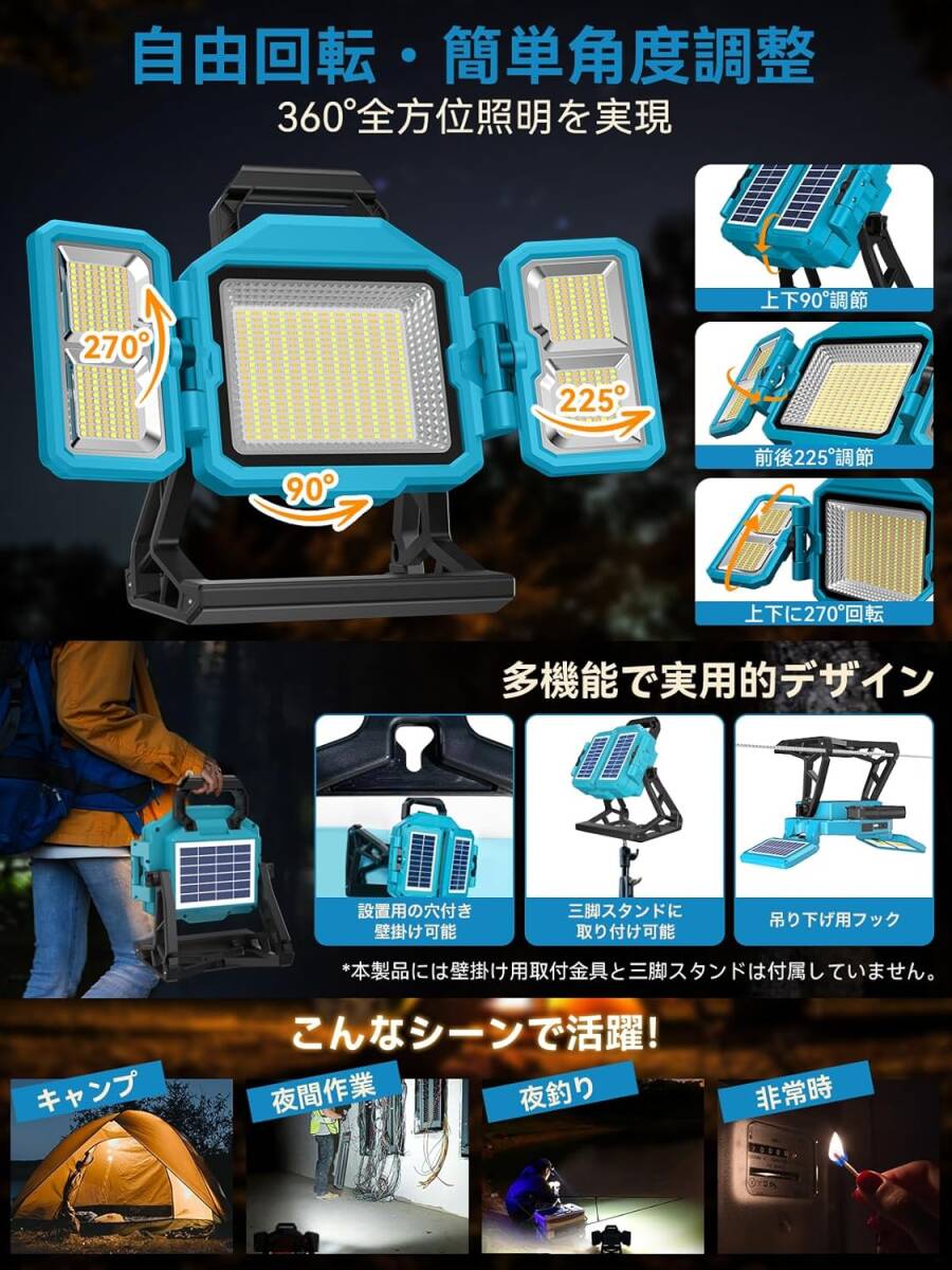 【IP65防水防塵・防衝撃性UP・高品質素材】密封性に優れ、IP65レベル高い防水・防塵性能を実現!製品の安全のため、水に浸さないでください。また、ミリタリーグレードのABS/PC素材を採用し、高強度の性能を持ち、落下や衝撃に対して優れた安定性を発揮します。頑丈な構造により保護性が向上し、偶然の落下や衝突による損傷を効果的に軽減します。 内部部品の安全性を確保し、照明器具全体の耐用年数を延ばします。 高い耐衝撃性により、投光器は、外部からの衝撃による機能不全を心配することなく、屋外の冒険、建設現場、または過酷な環境での使用に適しています。さらに、従来モデルより15%軽量化され、持ち運びにハンドル付き、より便利な体験を提供!