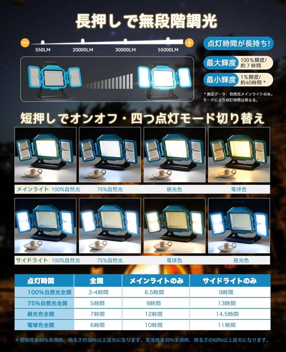 【360°全方位無死角照明・無段階調光・4つ点灯モード】投光器のメインライトは上下90度、サイドライトは前後225度・上下270度の回転調整が可能で、全体で360度の全方位照明が実現できます!360度発光機能により、より多様な設置環境やニーズに適応します。全周照明設計により、死角のない光範囲が保証されます。屋内スペースであっても屋外エリアであっても、均一な照明効果を実現し、影の領域を減らし、全体的な照明の品質を向上させることができます。エリア全体を照らすために複数の指向性ランプが必要な状況と比較して、当社の 360 度投光器は必要なランプの数を減らし、初期投資とその後のメンテナンスコストを削減できます。また、本LED投光器は長押しで無段階調光、短押しで点灯/消灯、四つ点灯モード切替、メインライトとサイドライトの個別点灯または全点灯が可能です。