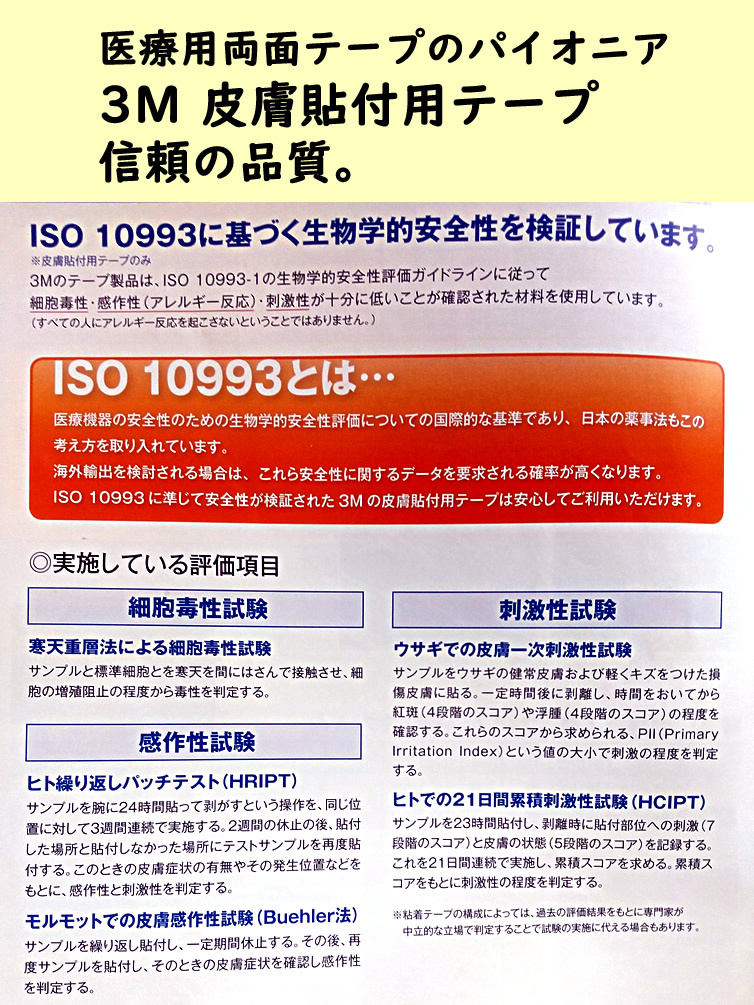 皮膚貼付用両面テープ 3M製品 ISO-10993に基づく、広範囲な安全性が確認されてます。 ●細胞毒性試験 ●急性初期皮膚刺激試験 ●皮膚刺激試験 ●皮膚感作性試験等 |
