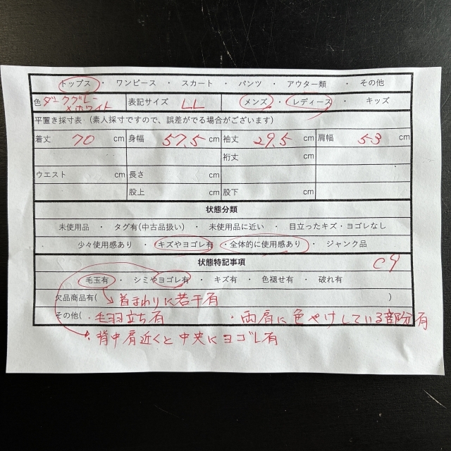 ・シミやヨゴレ有(背中肩近くと中央にヨゴレ有)