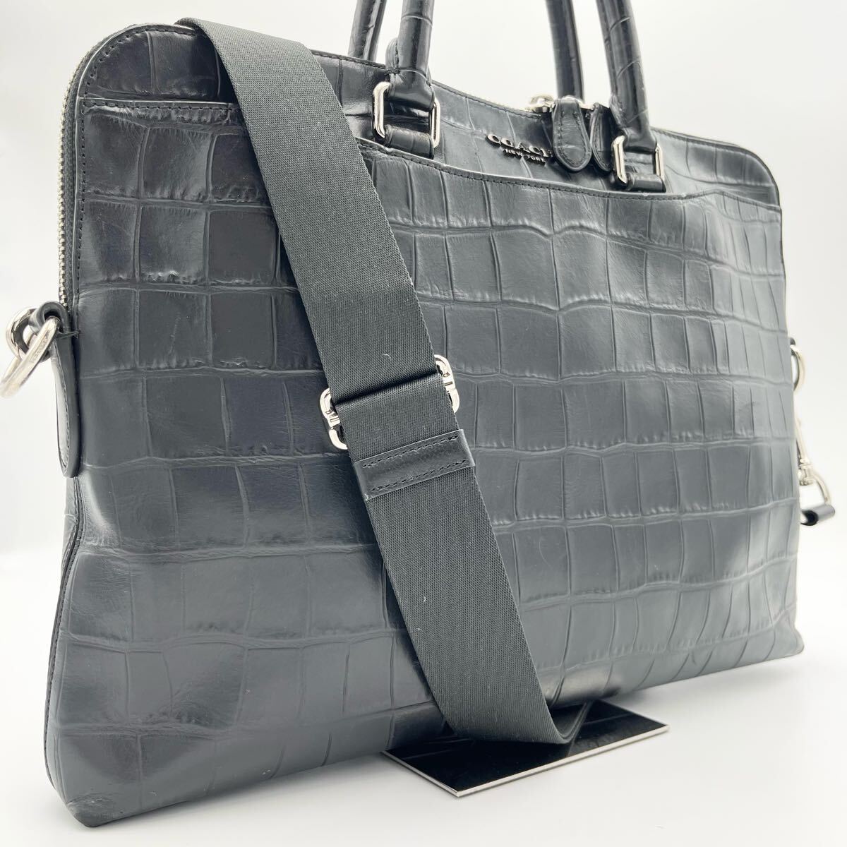 1円 希少 クロコ コーチ COACH ロゴプレート 型押し ハンド ショルダーバッグ 2way PC&A4 ビジネス メンズ ブラック 黒 レザー 革 F72970