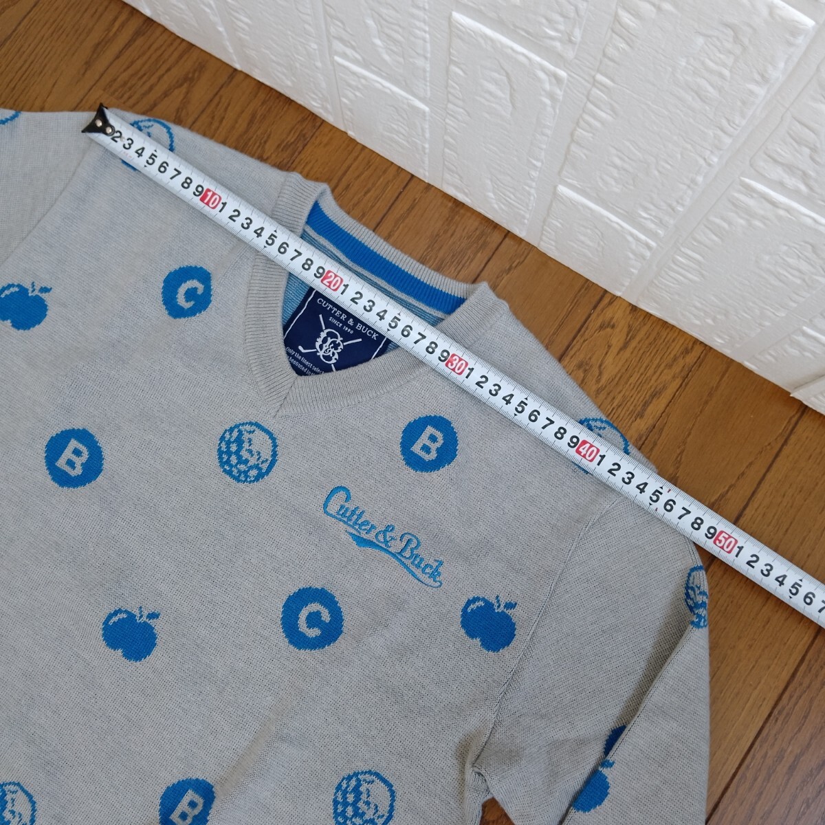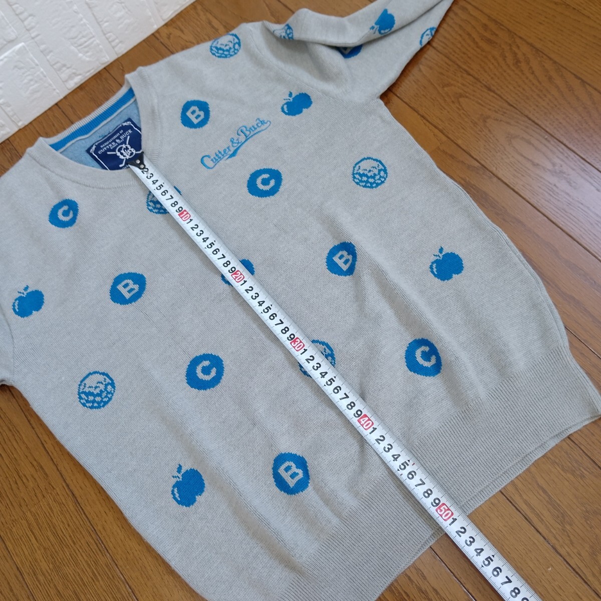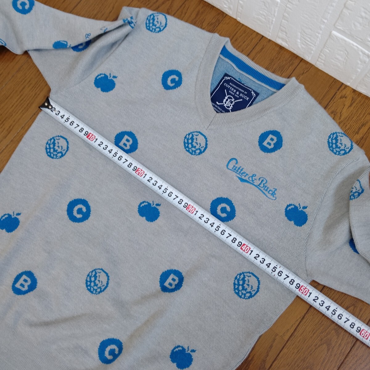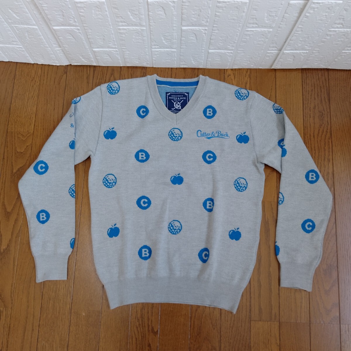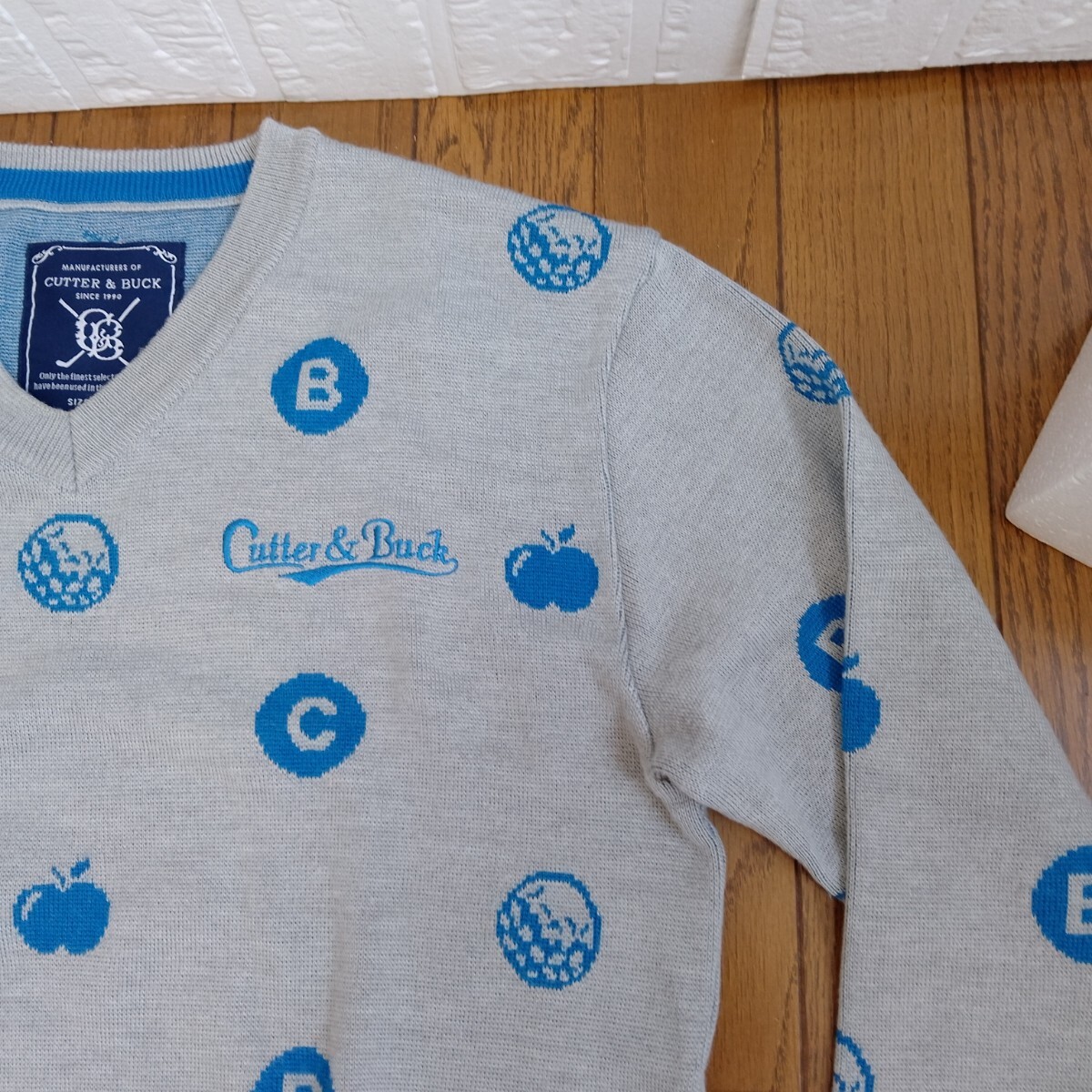 CUTTER&BUCKのVネックセーターです。色はグレー地に青のリンゴ、ゴルフボール、カッターバック『C』『B』のデザイン、左胸に光沢のある青の『CUTTER&BUCK』のロゴ刺繍がデザインされています。