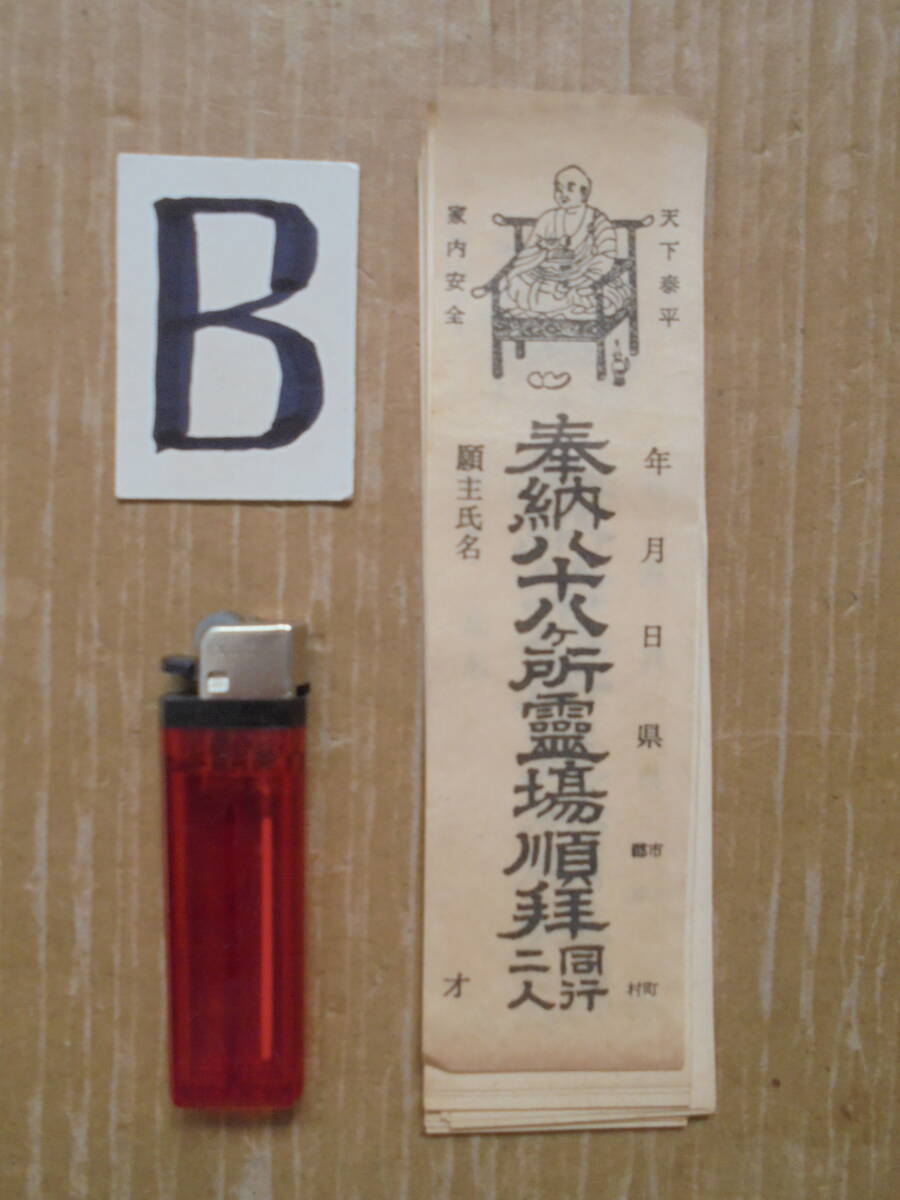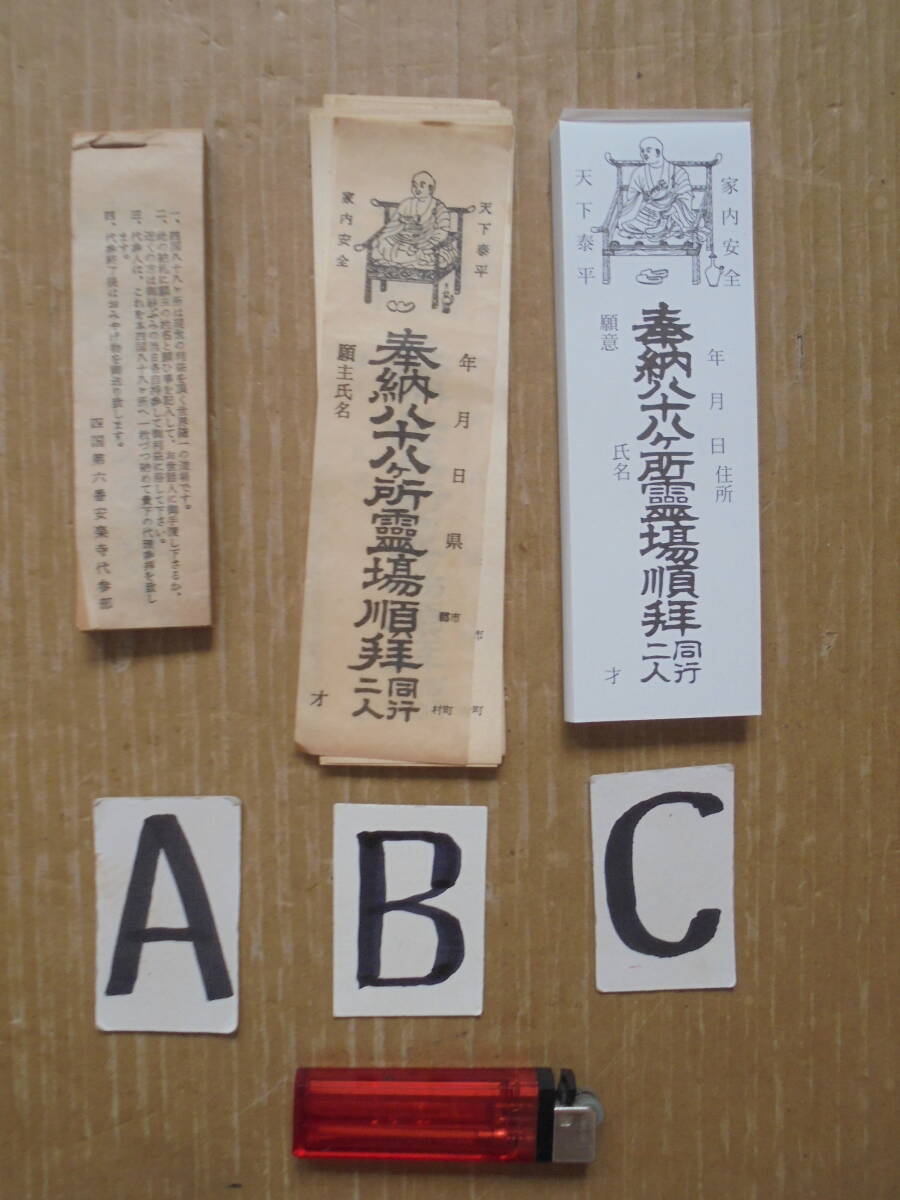 明治・大正・昭和時代の四国88カ所納め札です。経年の変化で、ヨゴレ、スレ、ヤケがあります。お遍路の変遷の貴重なお遍路資料です。送付は安価なクロネココンパクト便等が利用できます。 (A)明治~大正時代の納め札で100枚程度あり、縦12.5㎝、横幅3.5㎝程度あります。 (B)大正~昭和時代の納め札で30枚程度あり、縦16.5㎝、横幅4.5㎝程度あります。 (C)現在の納め札で70枚程度あり、縦15.5㎝、横幅5㎝程度あります。 ◎ 当品の送料はコンパクトサイズで、「ヤフ-指定おてがる配送のクロネコ割引価格」と同料金です(送料は落札者負担で匿名配送不可です)。定形外が可能な商品は、当方が取引ナビにてご提案させていただきます。 ◎当方の出品商品は、今後の落札の有無にかかわらず、7日間程度の取り置き(同梱包)をお伺いいたしますので、取引ナビに「取置希望」を明記していただければ、取り置きを歓迎しますのでごゆっくりどうぞ。なおヤフ-システムではかんたん決済利用は落札後5日以内となっており、それ以降は銀行振り込みとなり詳細は落札後ご案内します、簡明のため落札毎のかんたん決済も歓迎します。 ◎また商品の作者が明記され真作・肉筆と記載している場合、真作・肉筆が疑われる根拠がありましたら返品・返金します。 ◎なお当方が入手した個人情報は、この取引以外には使用しない、他の商品等のダイレクトメ-ルをしない、取引完了1ヶ月後には全ての個人情報を消去する事を厳守いたします。