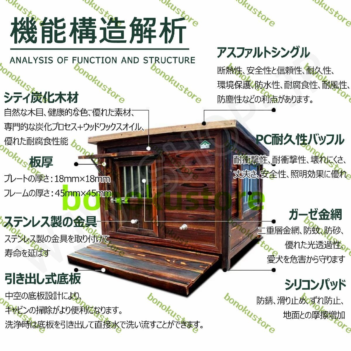 【四季少し傾斜平らな屋根設計、防水・防湿、耐久性の構造】平らな屋根の設計と完全に密閉された炭化木材構造により、雨の浸入や湿気の侵入を効果的に防ぎます。屋内でも屋外でも安全に使用できます。屋根は平らですが、雨が降っても水が溜まらないように少し傾斜がついています。72 時間の高温炭化処理を経て、木材の安定性が 80% 向上します。耐熱性・耐寒性が非常に強く、-20℃~50℃の過酷な気候でも割れたり変形したりしにくく、一年中愛犬の快適な生活をサポートします。