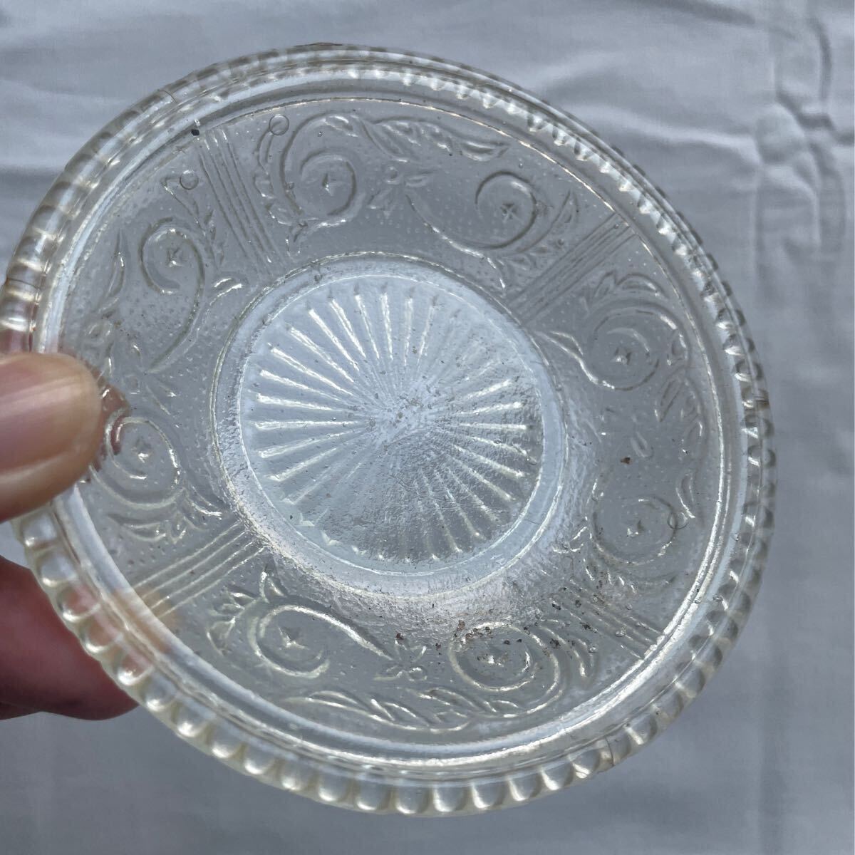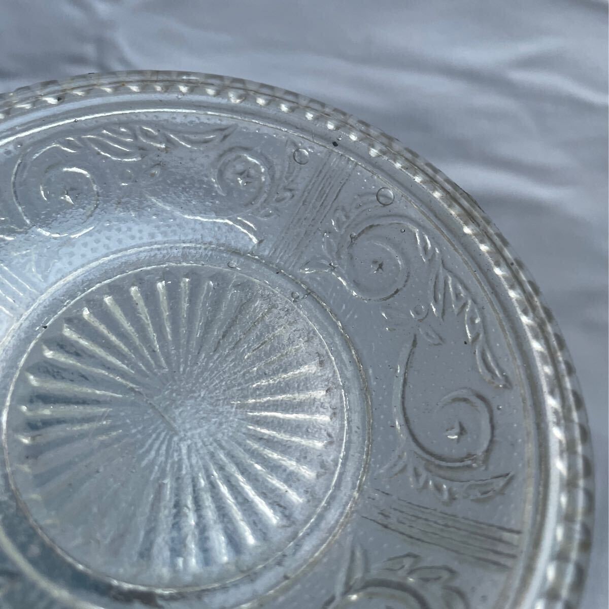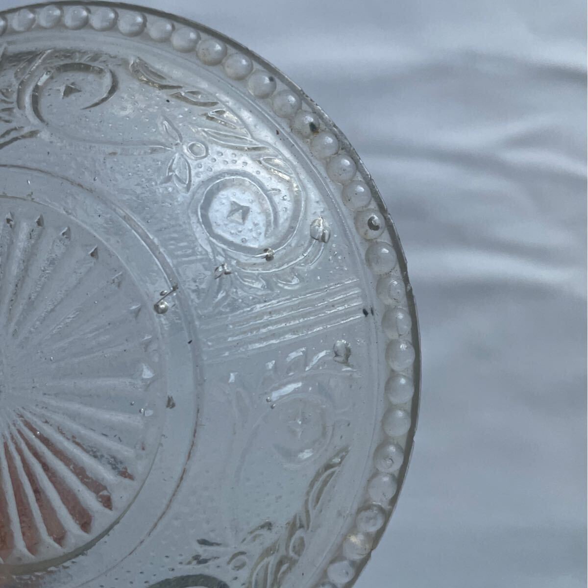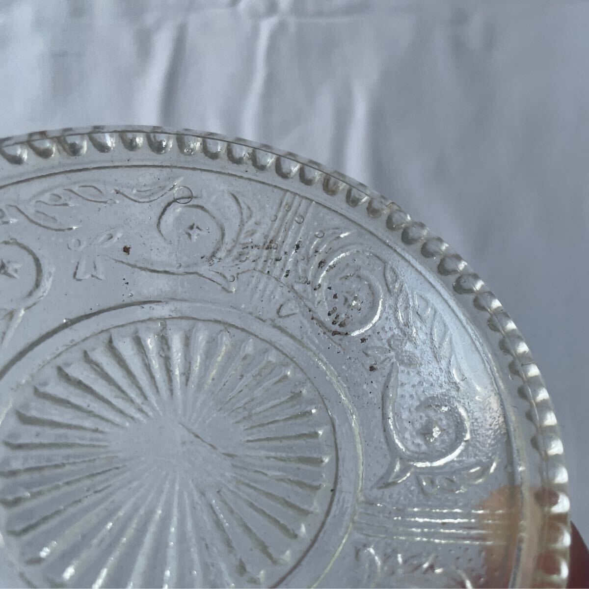 プレスガラスの皿です。多少の気泡、プレス皺、製造時からと思われる黒点のこびり付きがあります。縁のザリザリ感がかなりあり、欠けに近いものもあります。その他にキズはありません。