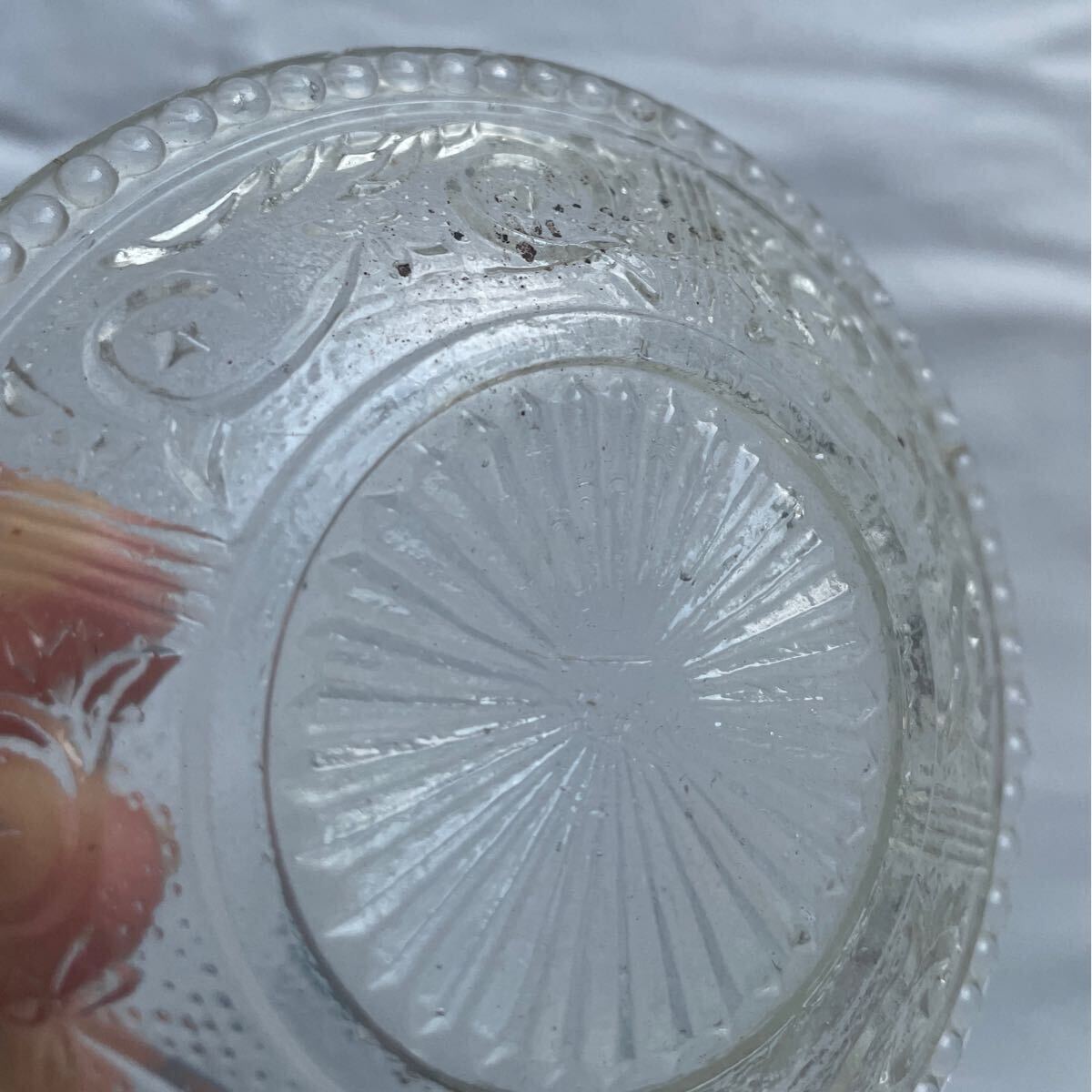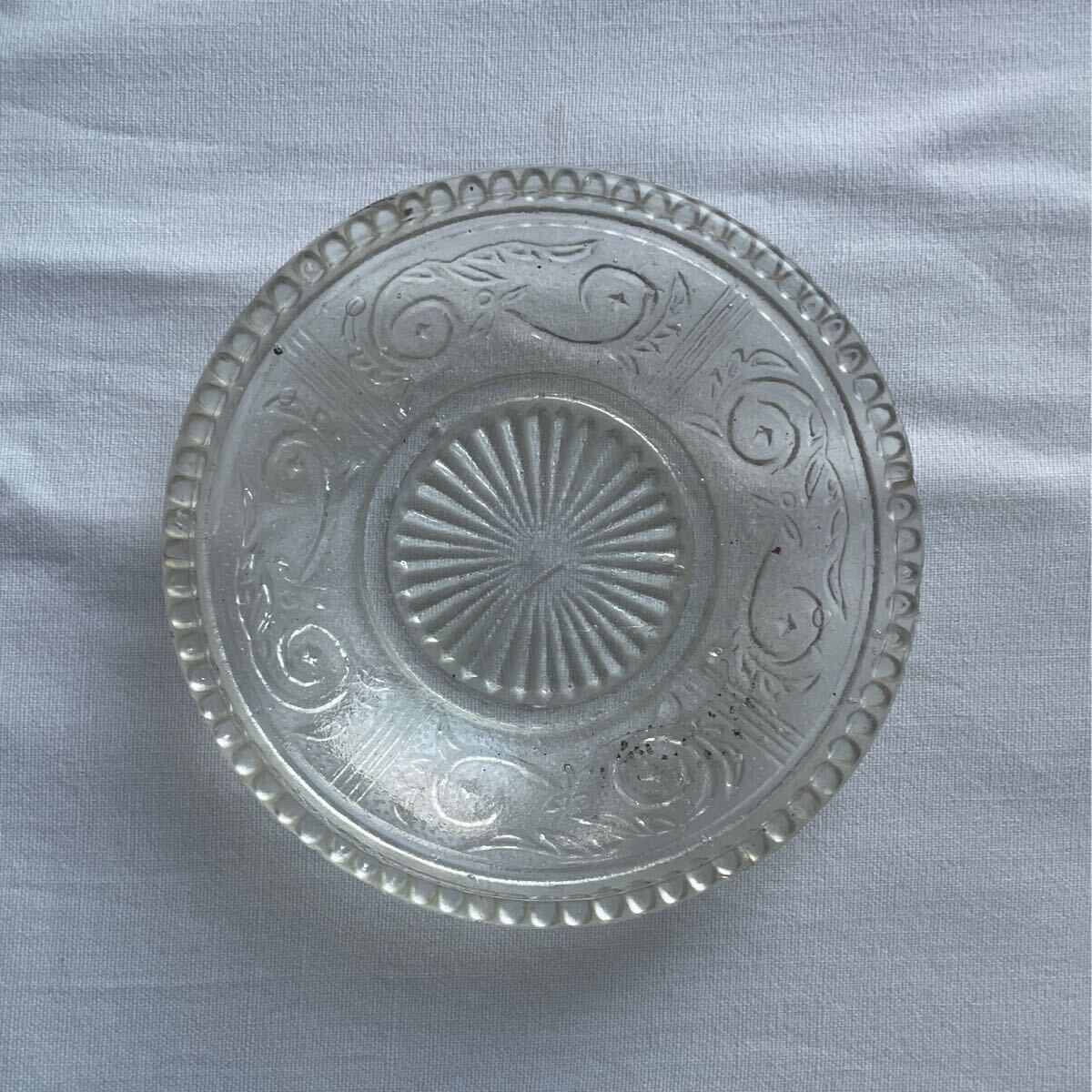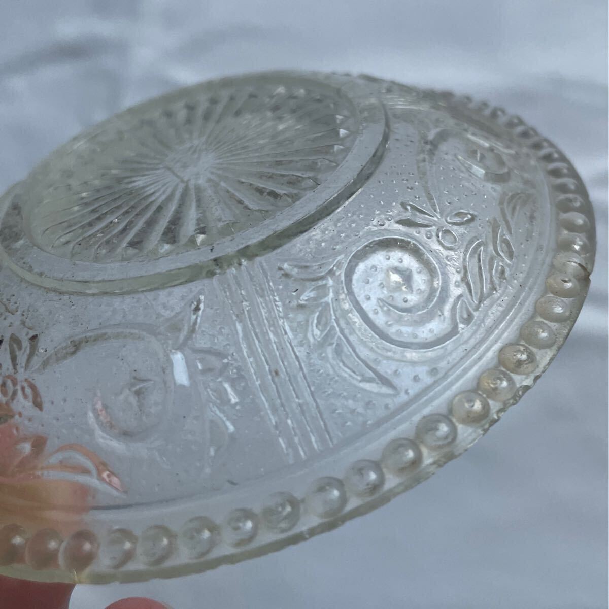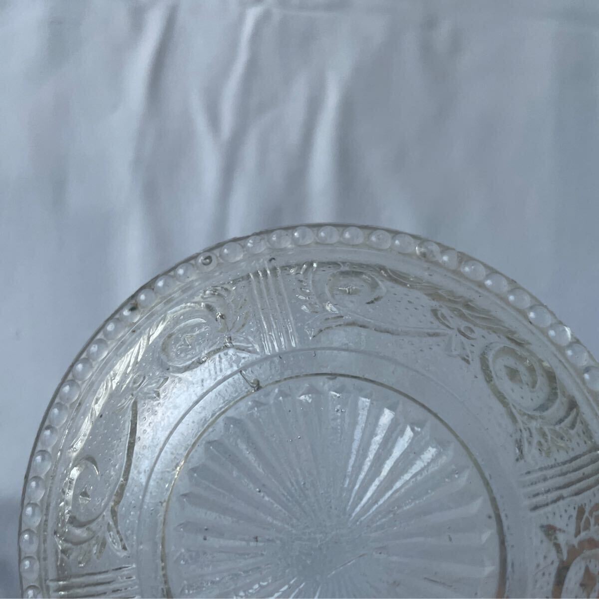 プレスガラスの皿です。多少の気泡、プレス皺、製造時からと思われる黒点のこびり付きがあります。縁のザリザリ感がかなりあり、欠けに近いものもあります。その他にキズはありません。