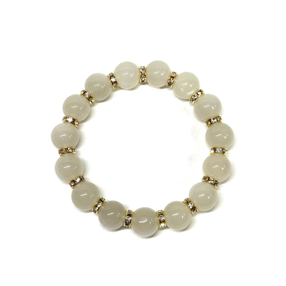こちらは、12mm玉のムーンストーンを使用したパワーストーンブレスレットです。間にはロンデルを挟み高級感を演出しております。男女問わずどんなコーディネートとも合わせ易いブレスレットです。サイズは内周約18cmです。(サイズ変更の場合は取引ナビにてご連絡をお願いします。) 数に限りがございますので気になる方はお早めにどうぞ。