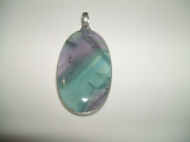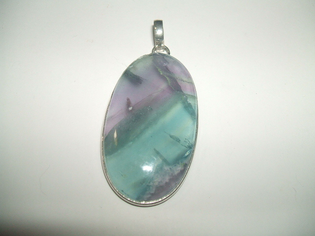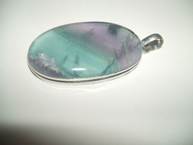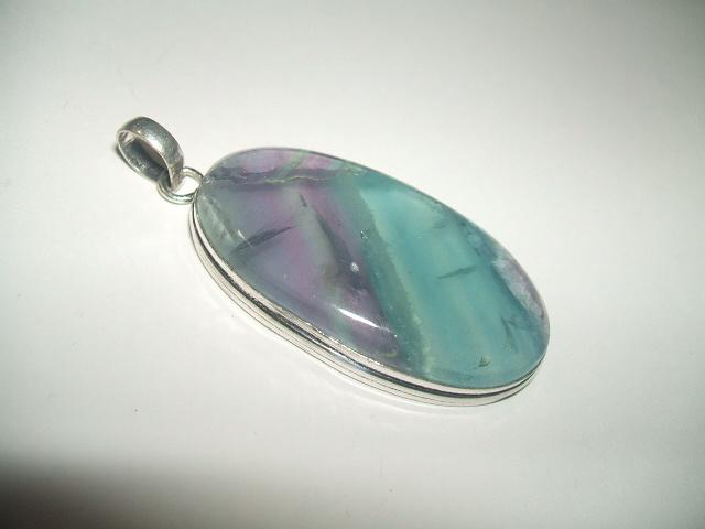 半透明のパープル、グリーンのボーダー模様が美しいフローライトトップです。。写真のように内包物によるくすみや内部の亀裂がありますので、あらかじめご了承ください。石の表面にキズはありません。石の大きさは4.5x2.5センチ。金属はシルバーで925の刻印があります。