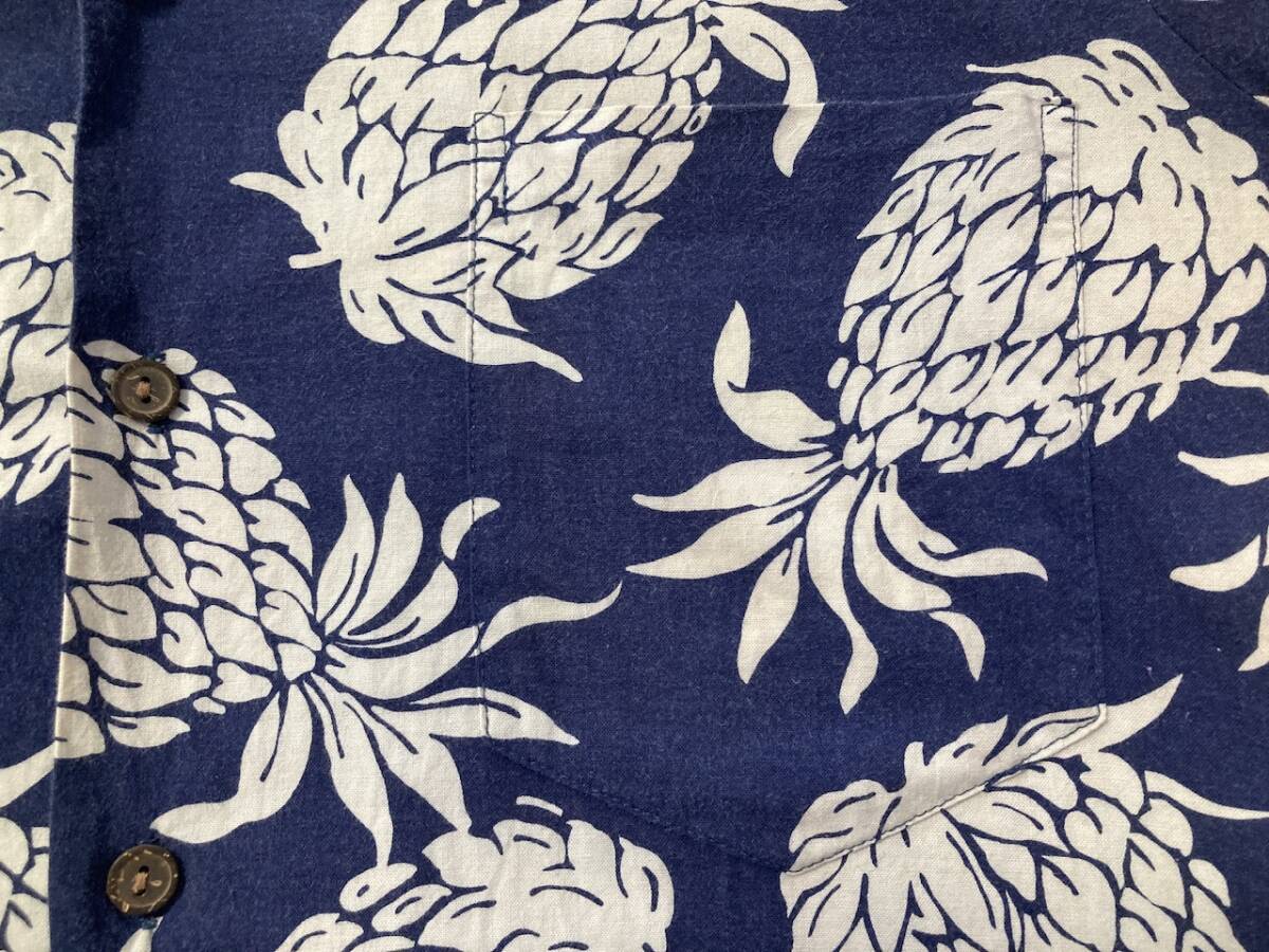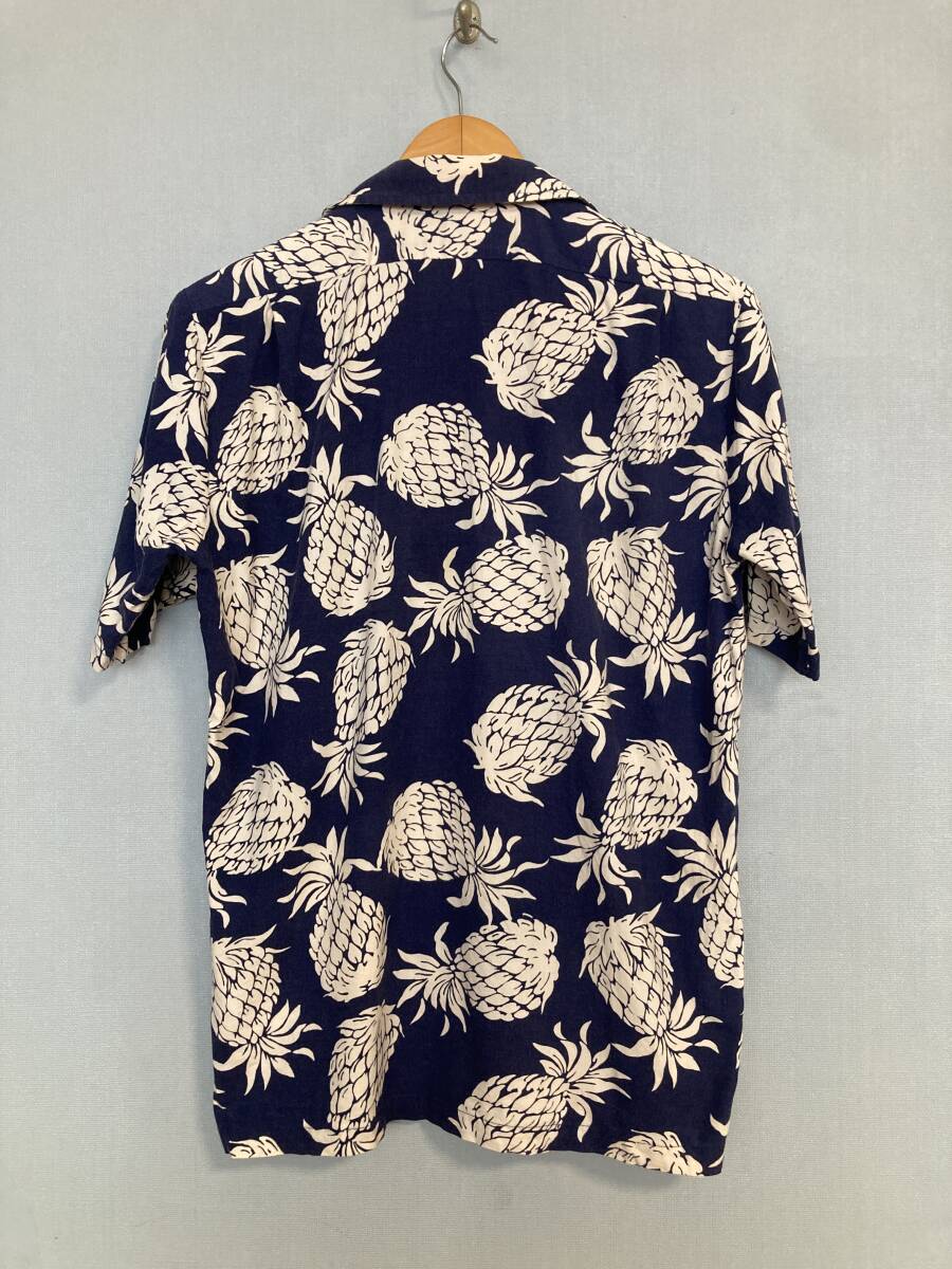 商品名:Hilo Hattie パイナップル柄 アロハシャツ サイズ:表記SMALL 平置き:肩幅44cm 身幅(脇下~脇下)51cm 着丈(襟付根~裾)70,5cm 袖丈(肩~袖裾)24cm ※素人採寸の為多少の誤差はご了承下さい。 カラー:ネイビー、ホワイト、レッド 状態:MADE IN HAWAII USA。コットン55%レーヨン45%。ポケット×1。幾分かの使用感等ありますが目立ったダメージ無く雰囲気良いと思います。 発送方法:レターパックプラス(配達記録付600円)orレターパックライト(配達記録なし430円) ※古物になりますので神経質な方、ご理解の無い方の御入札はお控え下さい。送料、振込手数料は落札者様の御負担となります。ノークレーム、ノーリターンでお願い致します。