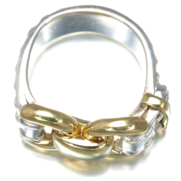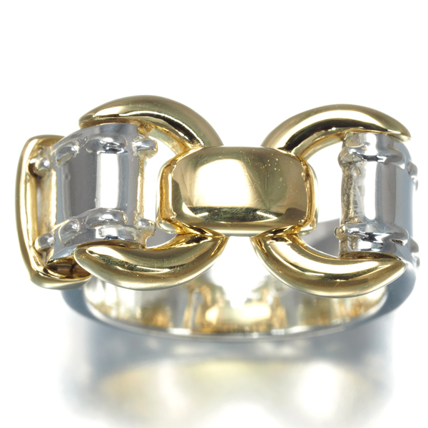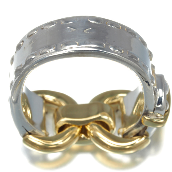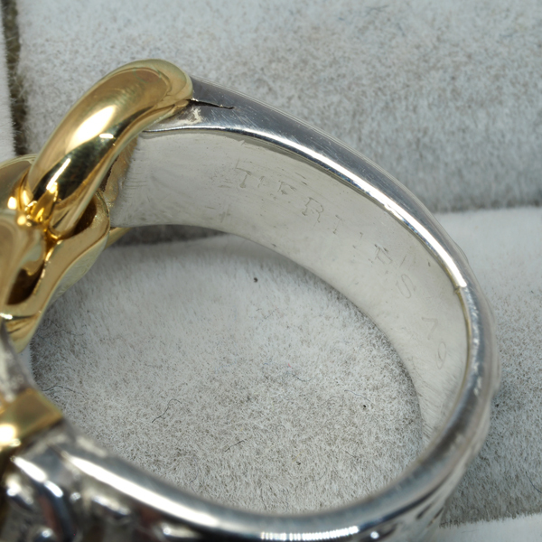 重厚な雰囲気を演出するシルバーリングへ華やかなゴールドのバックルデザインをあしらったエルメスのヴィンテージリングです。 |