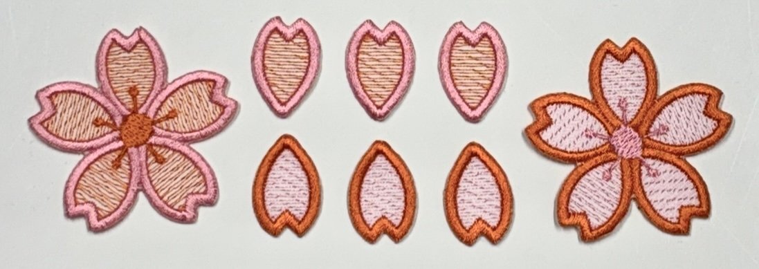 桜2枚と花びら6枚のセットで、各色濃淡のグラデェーションになっており、添付画像のイメージで張り付け可能です。