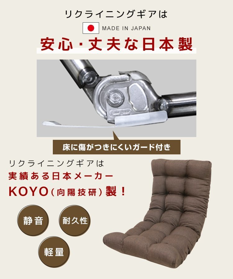 | ふんわりとした座り心地で体に優しくフィットする座椅子です。 大事な内部ギアは、世界でも活躍する実績ある日本メーカー「KoYo」の日本製! 42段階リクライニングで、曲げて、伸ばして、広げて・・・くつろぎ方、選び放題です♪ スマートロックギア搭載で、座ったまま、お好みの角度に調整ができます。 【商品詳細】 カラー:ブラウン サイズ(約)幅60x奥行60x高さ76cm 座面厚み:(約)15cm 収納サイズ:(約)幅60x奥行63x高さ35cm 重量(約)7.2kg 素材:麻リネン布、ウレタンスポンジ、鋼管 【注意事項】 ・この商品はカバーリングではありません(洗濯不可) ・生産ロットが違う場合、柄・色味が若干変わってくる場合がございます。 ・商品を使用して発生した事故・トラブル・破損等につきましては一切の責任を負いかねます。 ・商品は、モニターによって色合いが異なって見える場合があります。 ・仕様・デザインは改良のため予告なく変更することがあります。 |