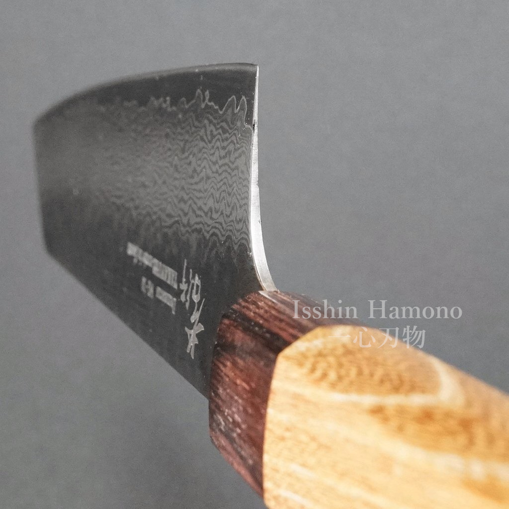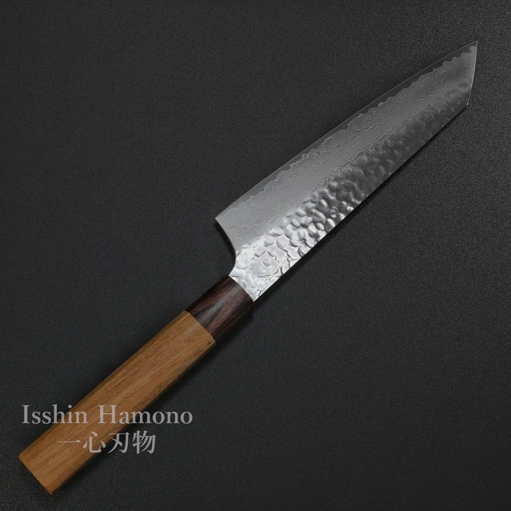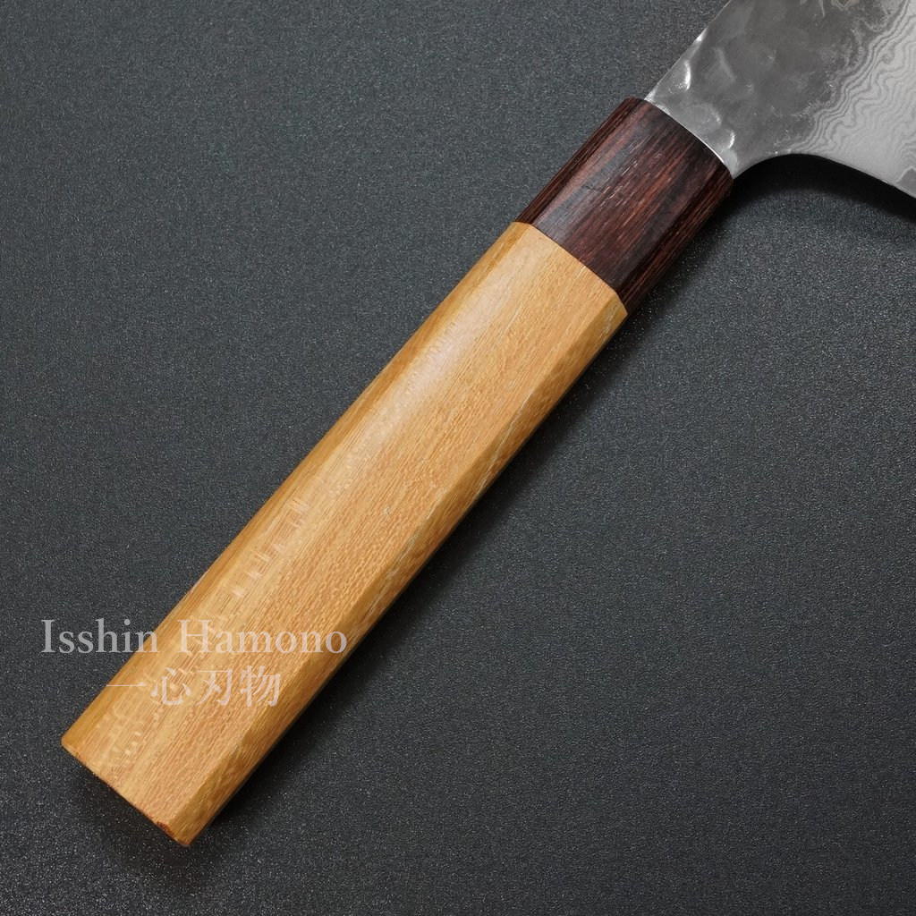 心材の刃はV金10号が使用されています。一般的にモリブデン鋼・モリブデン・バナジウム鋼・特殊鋼・硬質ステンレス・特殊ステンレスと記載されているものよりも高級な材質です。この材質はモリブデン、バナジウムだけでなくコバルトも含まれており、耐摩耗性、靭性、硬度の点で刃物鋼としての最適な条件を備えた高級ステンレス刃物鋼で、プロも使用しています。ステンレスですので、ステンレスではない包丁のように錆を気にする必要がありません。モリブデンとバナジウムが添加された医療用メスがよく切れるのはよく知られていますが、さらにコバルトが添加されているため鋭い切れ味がさらに持続します。つまり研ぐ回数を減らしてくれますので、メンテナンスが容易です。また槌目仕様は食材の切離れを良くしますので、お料理がスムーズに運びます。