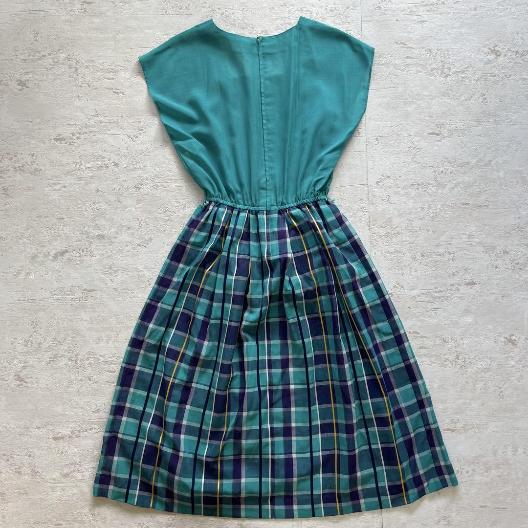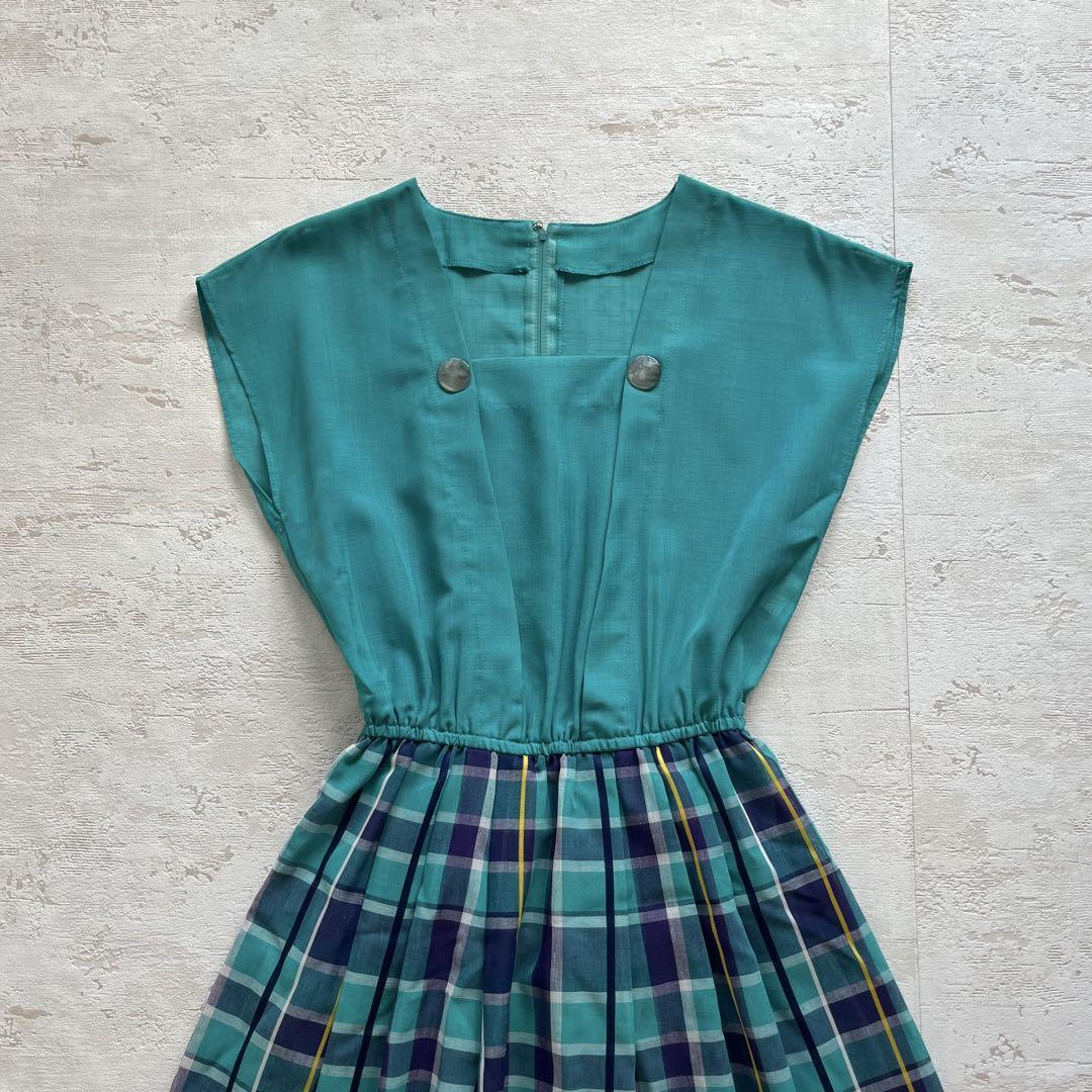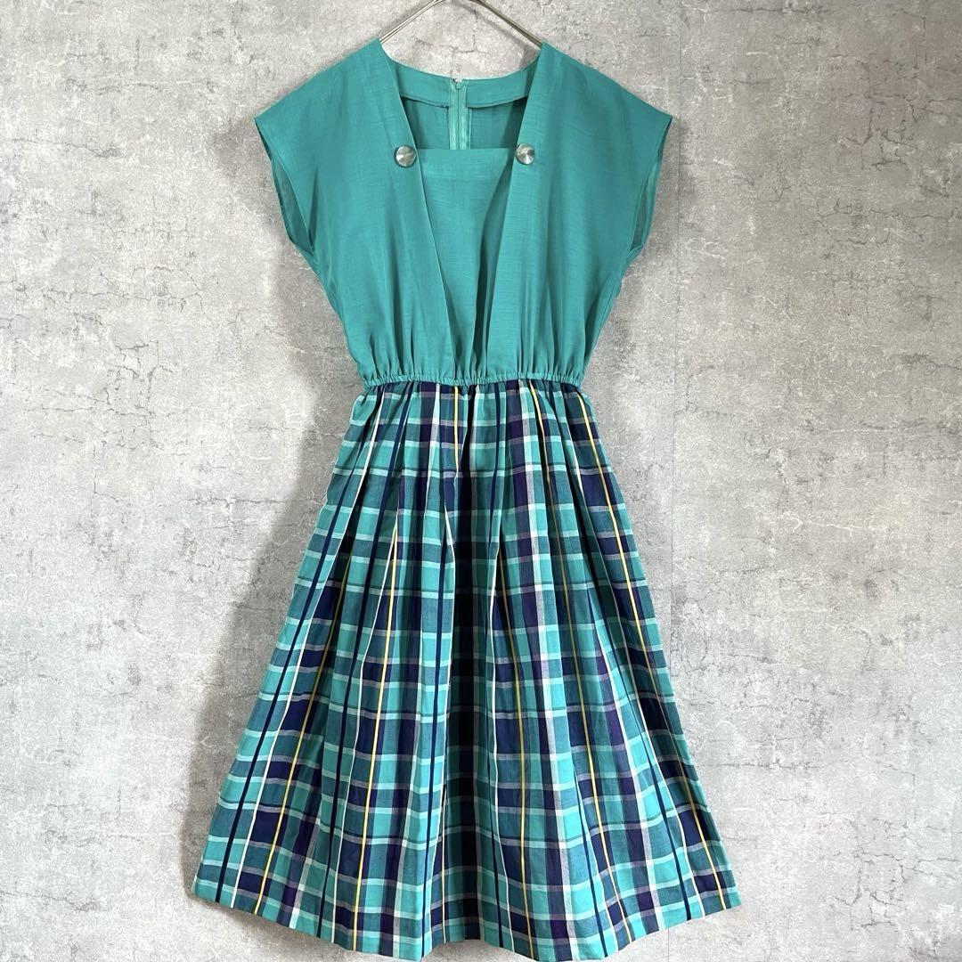 昭和レトロ 配色チェック柄 スカート切替 グリーン ワンピース 半袖 J2