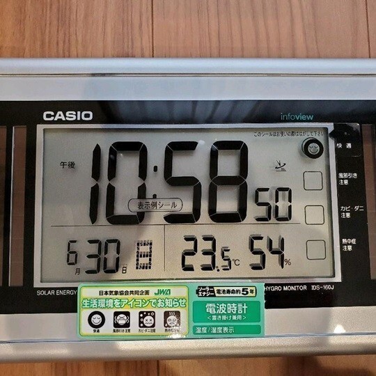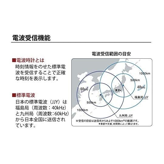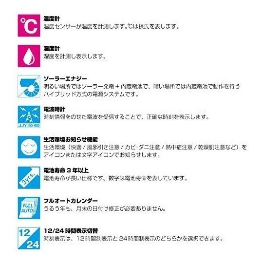 材質:樹脂機能:電波受信機能 (自動受信/手動受信)、ソーラーエナジー (ソーラー発電と内蔵電池で動作を行うハイブリッド式)、温度計測表示、湿度計測表示、生活環境お知らせ機能(アイコン表示)、カレンダー表示、12/24時間制表示切替、置き掛け兼用