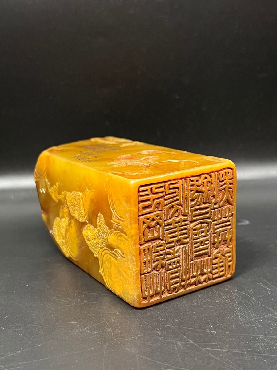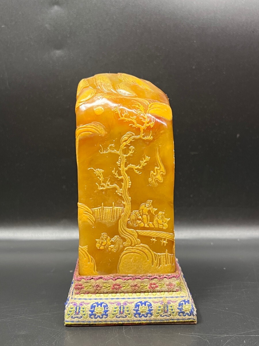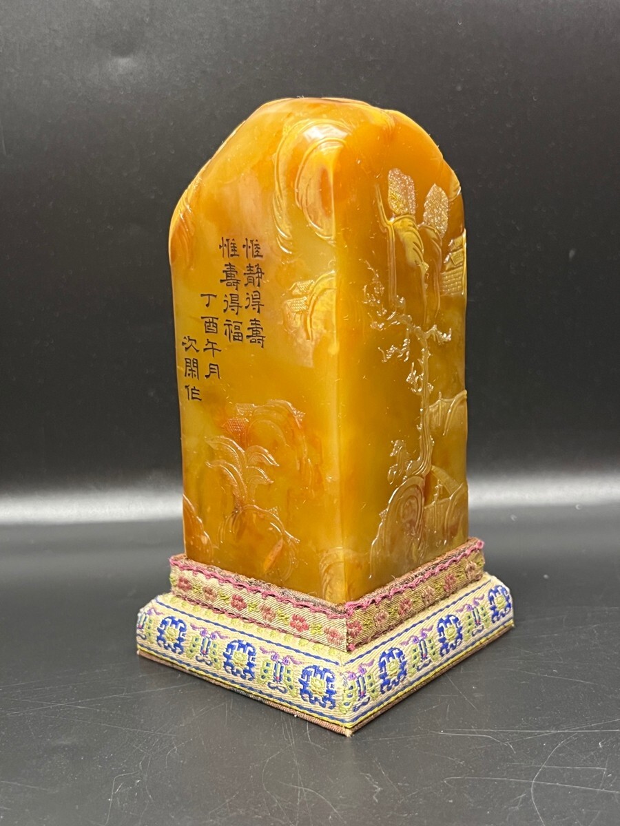 「清 次閑作 老寿山石 田黄石彫り 山水人物印章」極細工 擺件 古賞物 中国古美術 旧蔵出