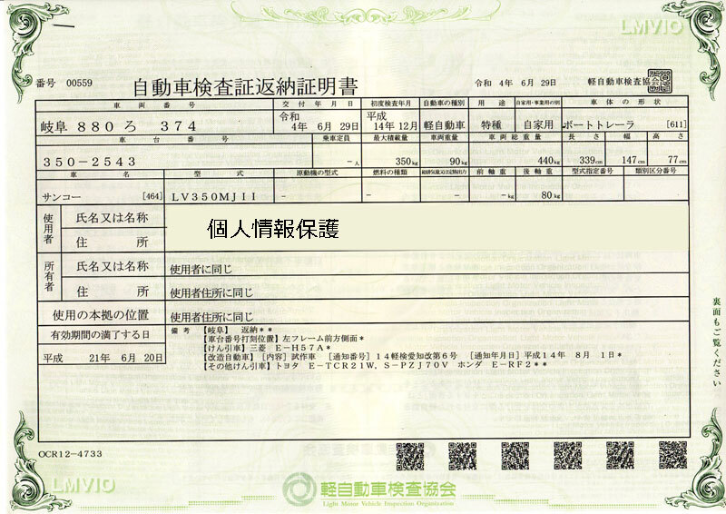 【現状販売/引き取り限定】サンコー製モナドトレーラー 自動車検査証あり 中古 [T022-035]