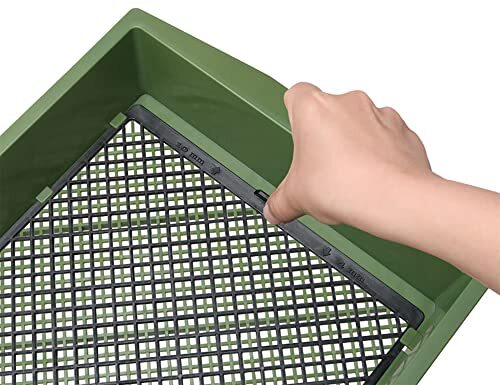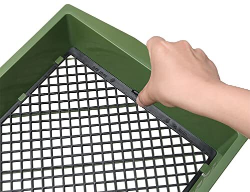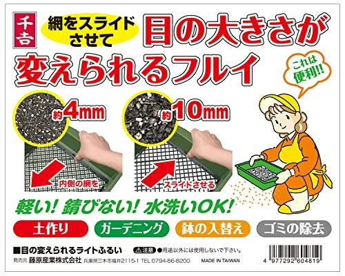 ビッグタイプ(外径サイズ:560×320mm)・グリーン 外径サイズ:560×320mm(ビッグタイプ) 4mm/10mm BIG・・Style:ビッグタイプ(外径サイズ:560×320mm)・目合サイズ:4mm/10mm・重さ:約630g・外形サイズ:横560×縦320×高85mm・内径サイズ:横505×縦295×高65mm・本体:ポリプロピレン目の大きさをワンタッチで変更できる樹脂製のふるい 【用途】 フルイ 【特徴】 ・中の網をスライドさせるだけで、簡単に目の大きさを変更できる ・目の大きさを変えたい場合でも、わざわざ替アミを持ち運ぶ必要がない ・全体が樹脂でできているため非常に軽く、また錆びの心配もない ・樹脂製のため、金属フルイの様な甲高い音がしづらく、住宅街やマンションのベランダなどの集合住宅でも音が響きにくい ・樹脂のため、汚れた場合でも水洗いが可能
