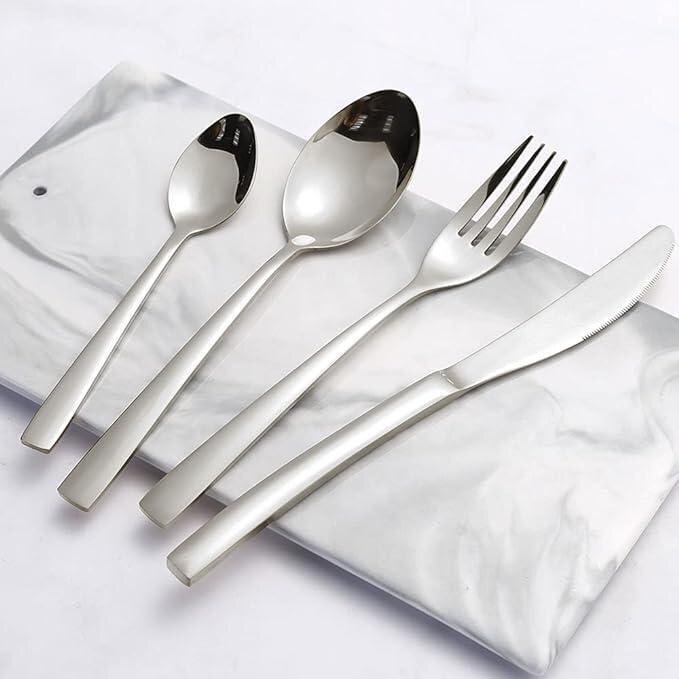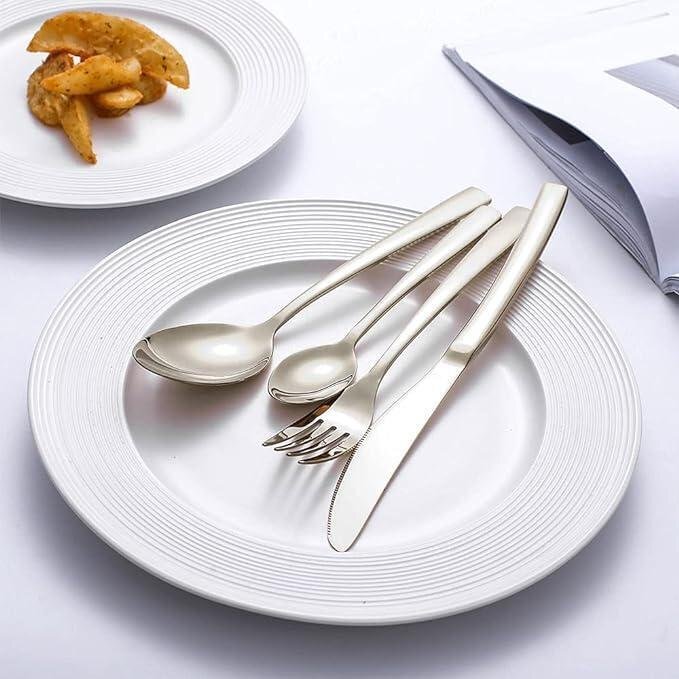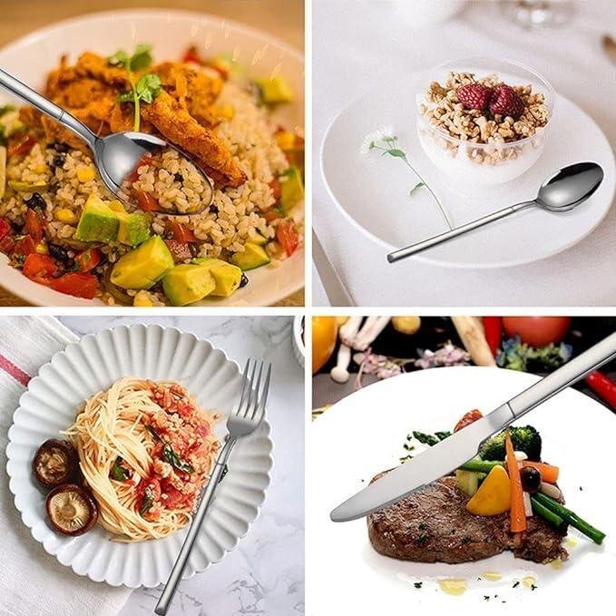 【サビにくい・メンテナンスも容易】錆に強く、耐摩耗性、靭性、硬度の点を備えた高級ステンレス刃物鋼で作成し、高級感が溢れるカトラリーセットです。レストラン向け、業務用、家庭用。ステーキナイフの刃先が丸まっていると、安心安全、子供にも向き。食洗機対応可能ですが、食器を長期間良好な状態に保つために、手洗いをお勧めします。
