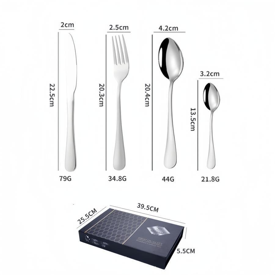 【商品仕様】素材:ステンレス 商品サイズ/重さ:(約)ステーキナイフ:23cm、ディナーフォーク:21cm、ディナースプーン:20cm、デザートスプーン:14cm 6人のほとんどの家族のニーズにも対応できます。レストランはユニークなスタイルで、キッチン、ホテル、レストランに最適です。仕様:食洗機対応可。上質なステンレスを採用し、高級感があり、テーブルに並んでるだけで食卓が華やかになり、いつもの料理が3割増しで美味しく感じられます。おしゃれなカトラリーセット!
