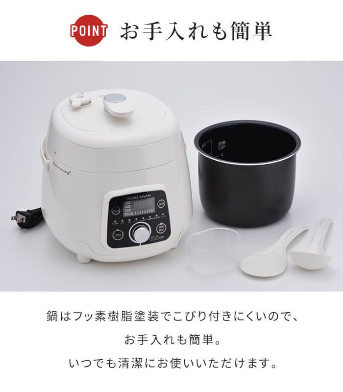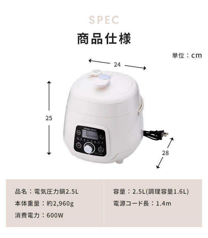 角煮が簡単に作れる電気圧力鍋。 材料を入れてほったらかしOK。 圧力・白米・角煮・カレーなどの8コース搭載。 ダイヤルでの任意設定も可能です。 鍋はこびりつきにくいッ素樹脂塗装。 容量2.5L(調理容量1.9L)のコンパクトサイズ。 かんたん調理レシピ付き。 |