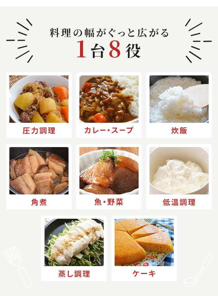 ・材料を入れてほったらかしOK ・簡単に角煮が作れる電気圧力鍋 ・圧力・白米・角煮・カレーなどの8コース搭載 ・ダイヤルでの任意設定も可能 ・鍋はフッ素樹脂塗装でこびり付きにくい ・かんたん調理レシピ付き |