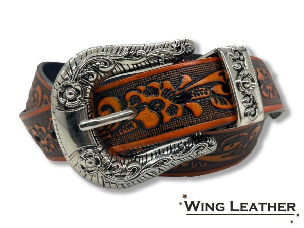 装飾の施されたバックル、サルカン、剣先が存在感あふれるウエスタンレザーベルト。