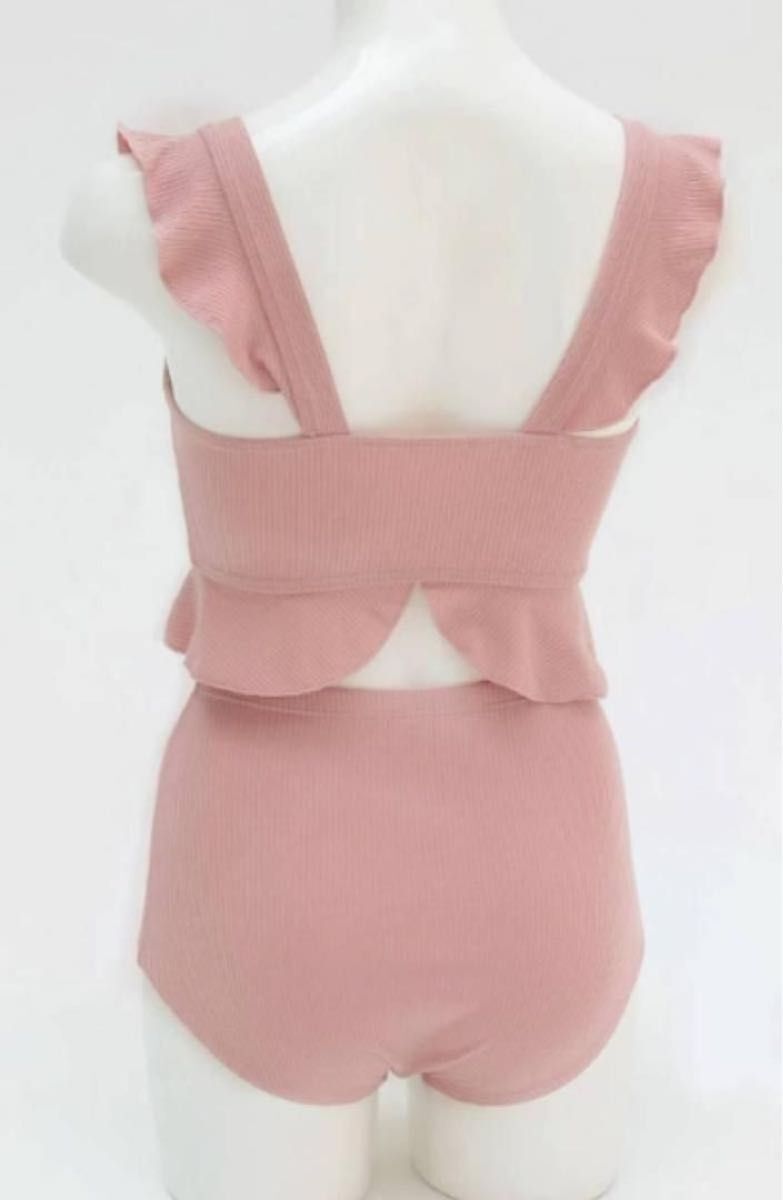 ショルダー部分とアンダーにフリルデザインをプラスした大人可愛いビスチェデザインビキニ。気になる腰回りをカバーできるハイウエストショーツ。