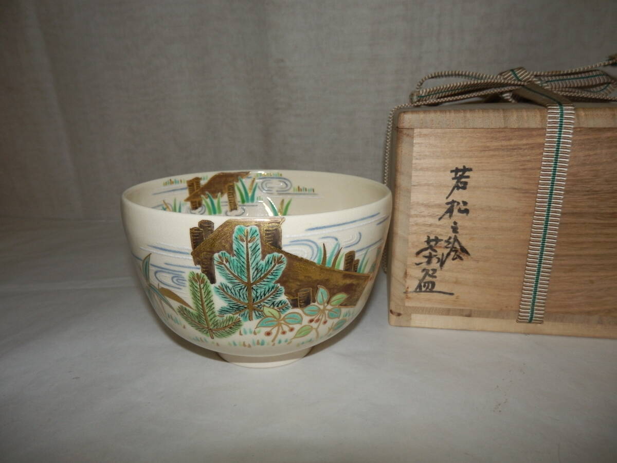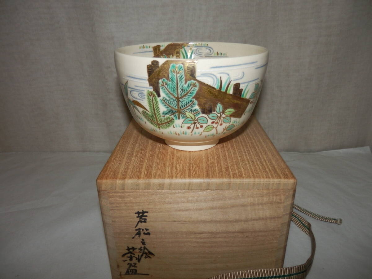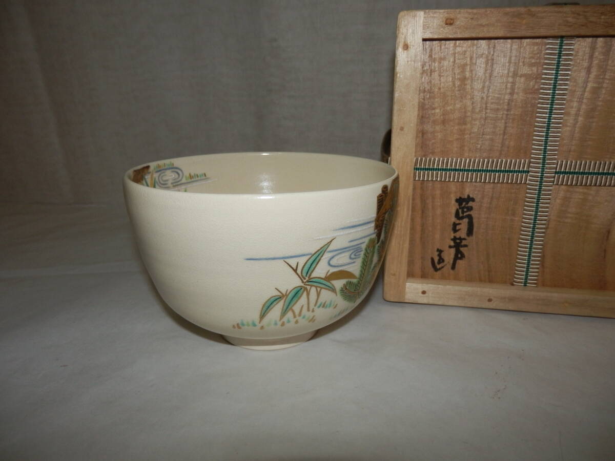 「中古品・茶道具」 京都の丹山窯の小峠葛芳さんの色絵の茶碗です。 若松之絵です。 径約12.3cm 高さ約8.1cm 高台に丹山の印有。 桐共箱「ヤケ、シミ等有」。 どうぞ宜しく。