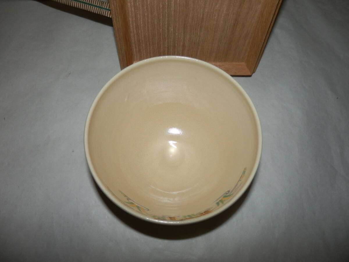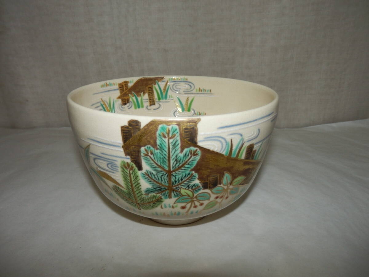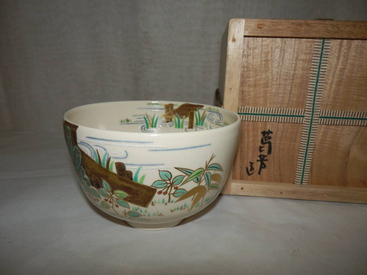 「中古品・茶道具」 京都の丹山窯の小峠葛芳さんの色絵の茶碗です。 若松之絵です。 径約12.3cm 高さ約8.1cm 高台に丹山の印有。 桐共箱「ヤケ、シミ等有」。 どうぞ宜しく。