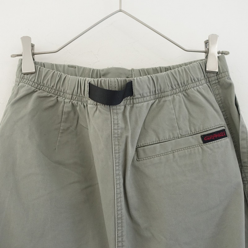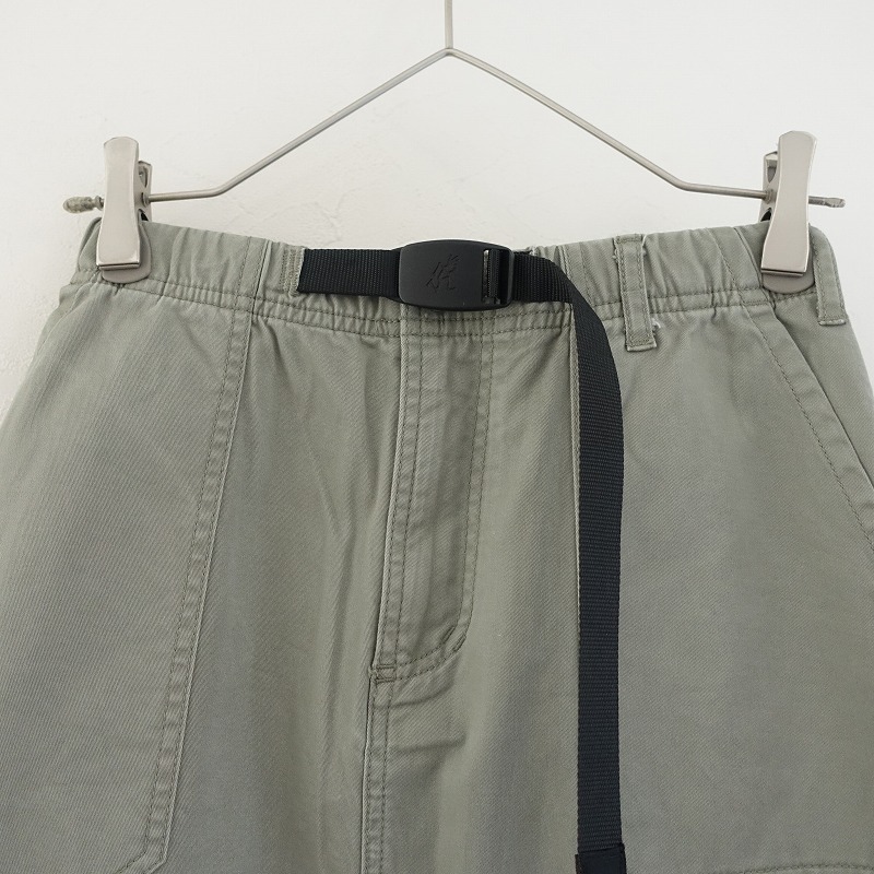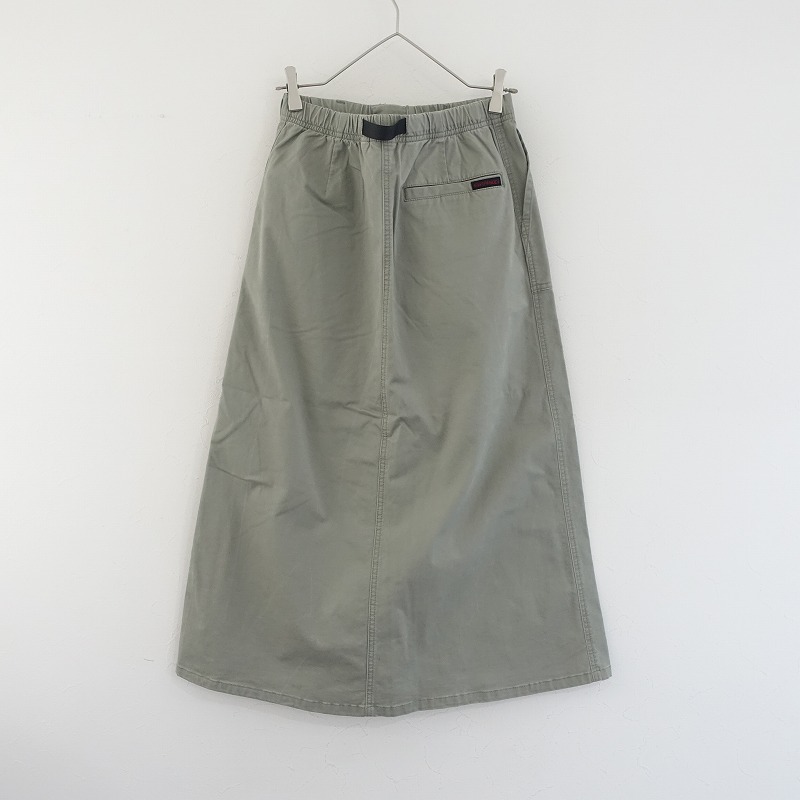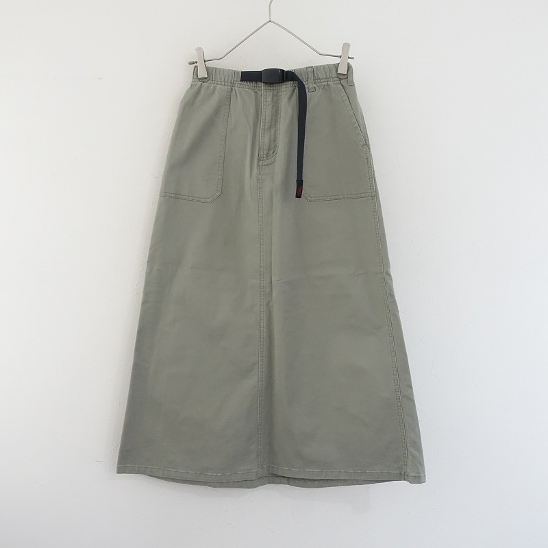 | GRAMICCIのベイカースカートです。カラーはグリーングレーで、ストレッチ性のあるツイル地です。フロントのボタン&ジッパーで着脱でき、ウエストゴム&ベルト入りです。前腰左右&右ヒップにポケットがあり、裏地は付いておりません。定価(メーカー希望小売価格)10,780円の商品です。 |