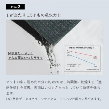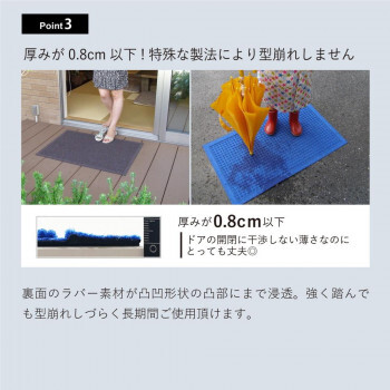 | 特殊製法による凹凸形状で立体的に水分や汚れを掻き取る業務用設計の玄関マット。キャッチした水分の85%が1時間後には乾燥、速乾タイプなので雨の日用マットとしても最適です。 ※モニターの種類やパソコンの環境により、実際の商品のお色と若干異なる場合がございます。 |