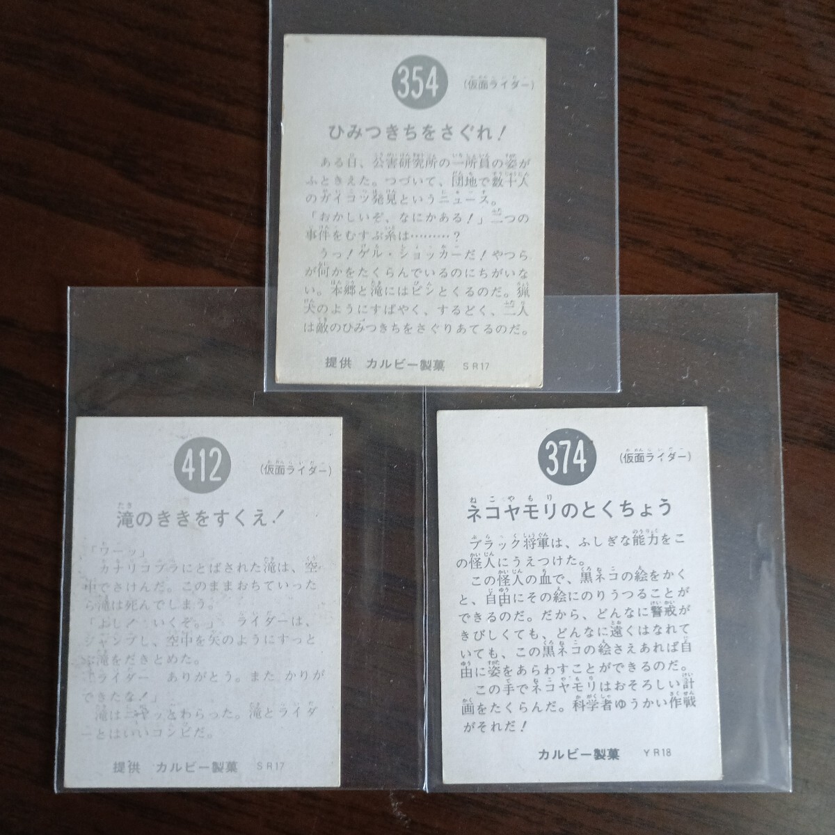 仮面ライダーカード354番(ひみつきちをさぐれ!)と374番(ネコヤモリのとくちょう)と412番(滝のききをすくえ!)の3枚セットです。詳細は写真等を参照の上で ご入札をお願い致します。 ノークレーム・返品不可でお願いします。(商品に関して神経質な方は入札をご遠慮くだい。)発送方法は、折れ・濡れ防止対策をして普通郵便で発送をいたします 。評価して頂いた方のみ、評価を入れさせて頂いております。 オークション終了後は、円滑な取引を心がけています 2日以内のご返信のご連絡をお願いします。