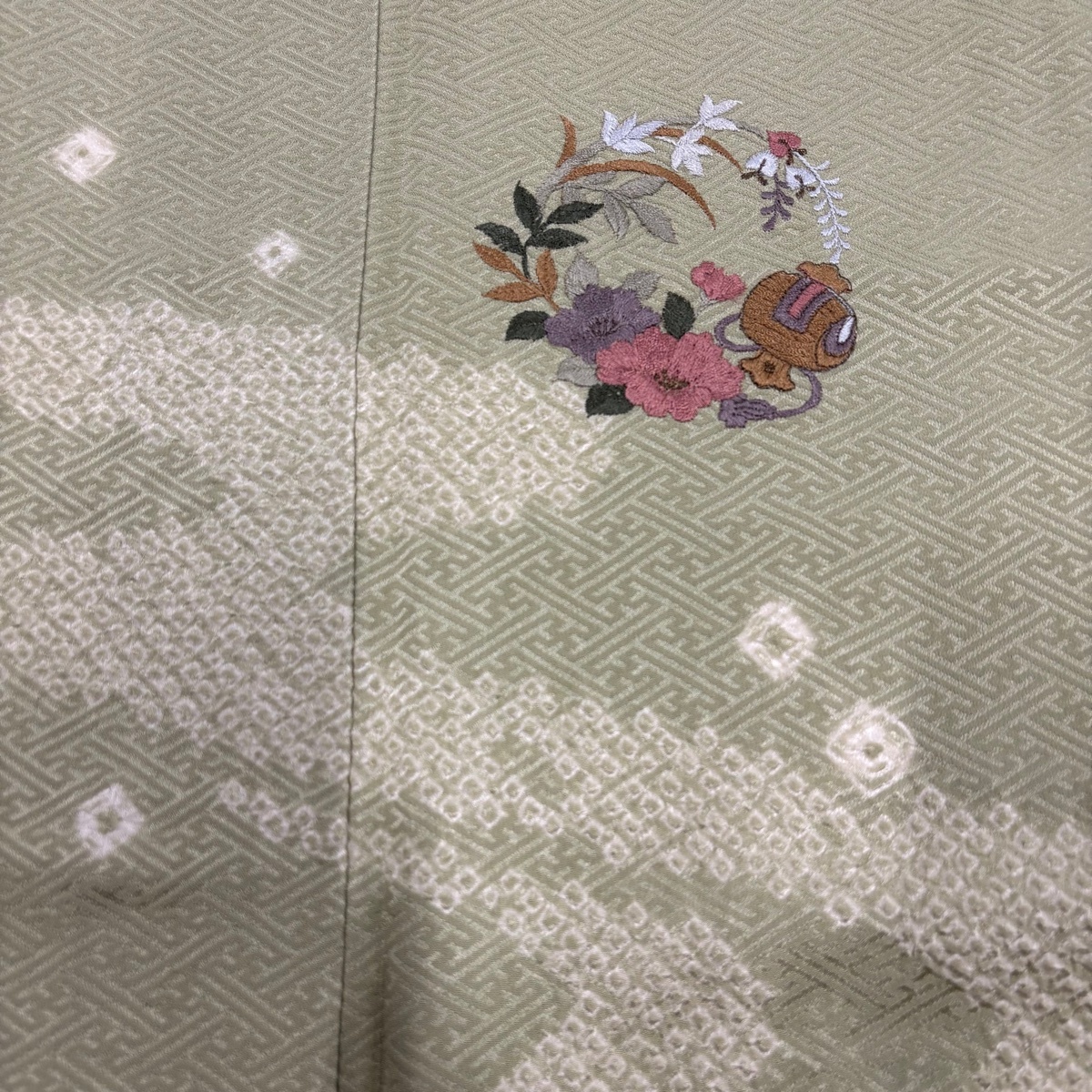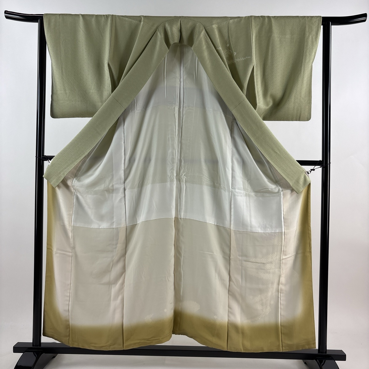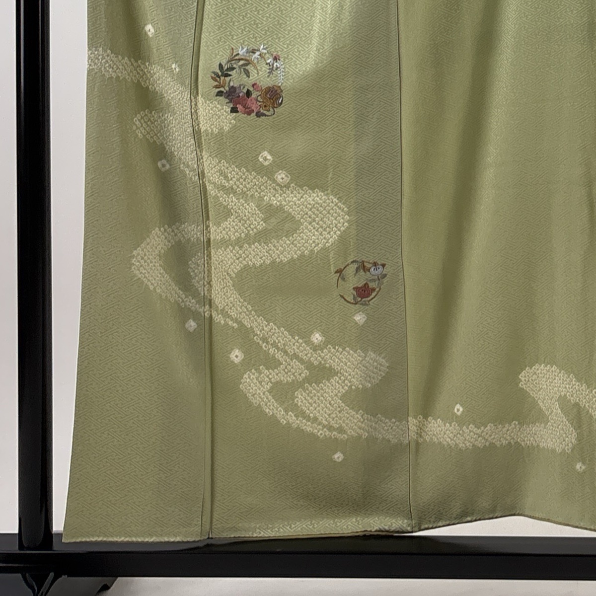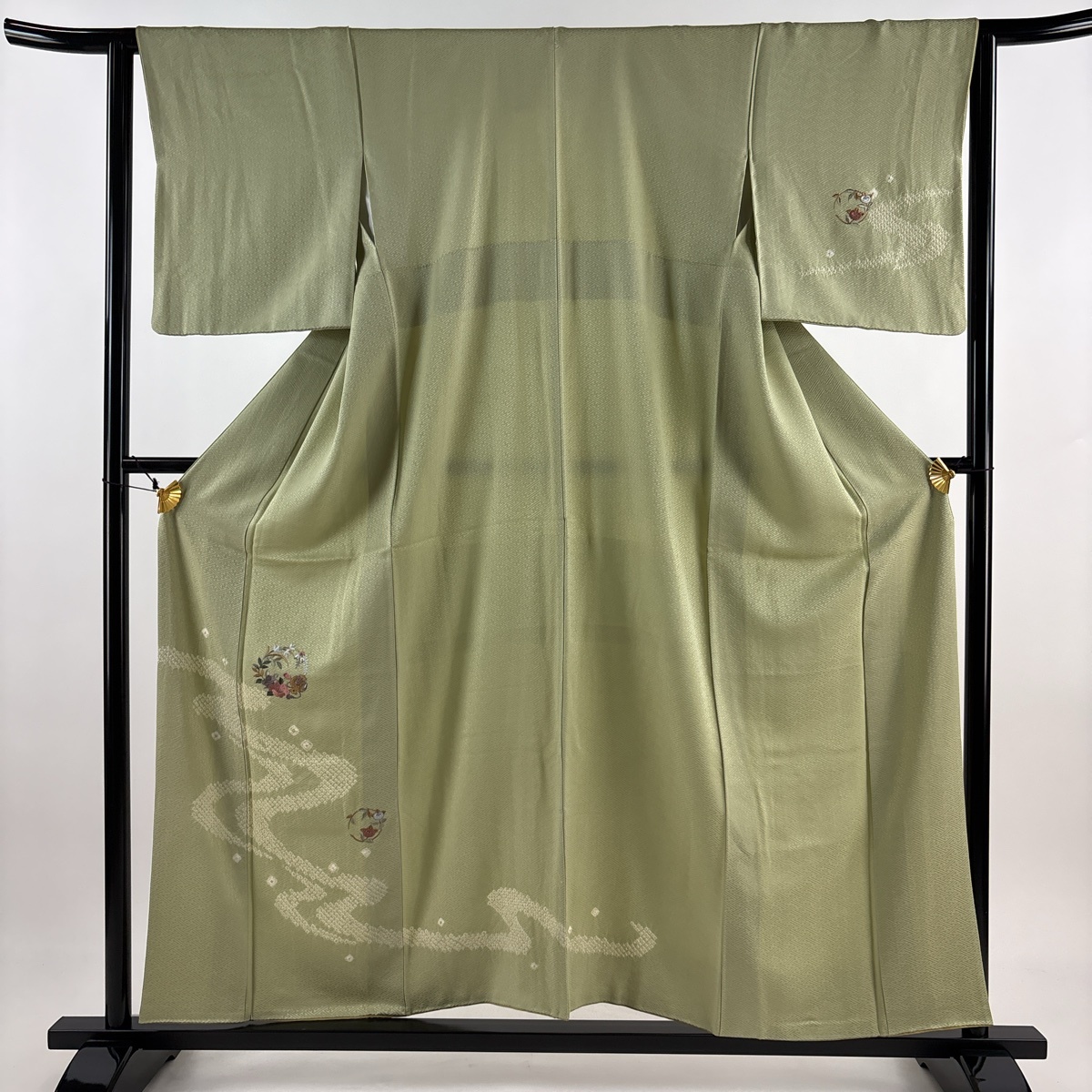| 付下げ 秀品 花丸文 流水 絞り 刺繍 薄緑 袷 身丈155.5 裄丈62 S 正絹 【中古】 |